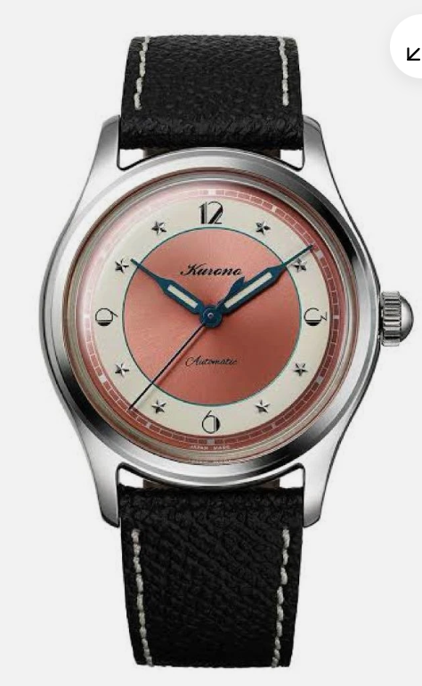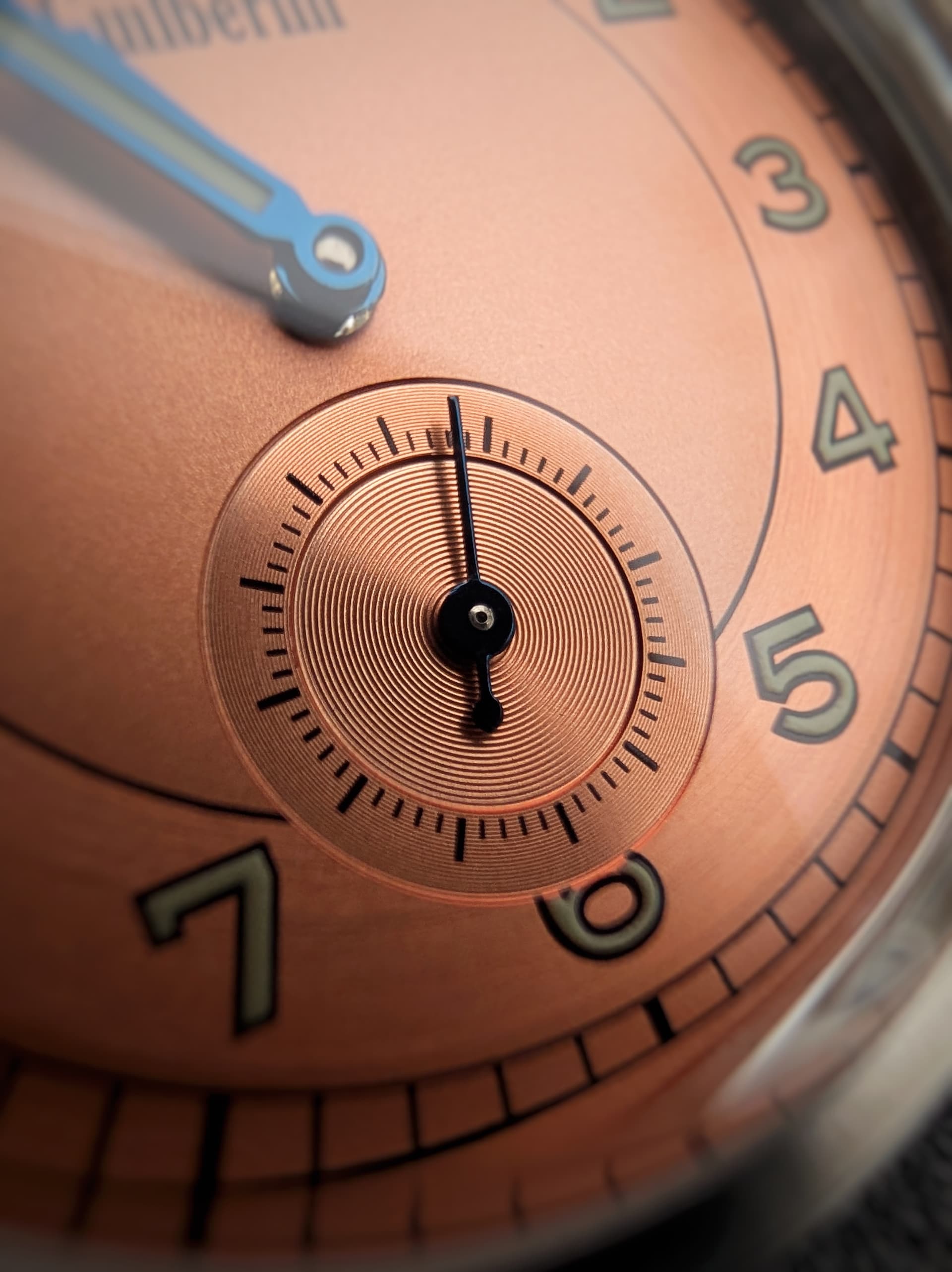 Afhankelijk hoe het licht erop valt kleurt de plaat van zalmroze naar koraal-oranje, met een licht-koperen ondertoon. De ring waar de cijfers in staan heeft een licht concentrisch patroon, de subdial voor de kleine seconde heeft meer uitgesproken ‘groeven’, die spelen met het licht.De ‘stepped’ kast heeft een fijne afmeting (38 mm) en is met een kleine 10 mm mooi slank.