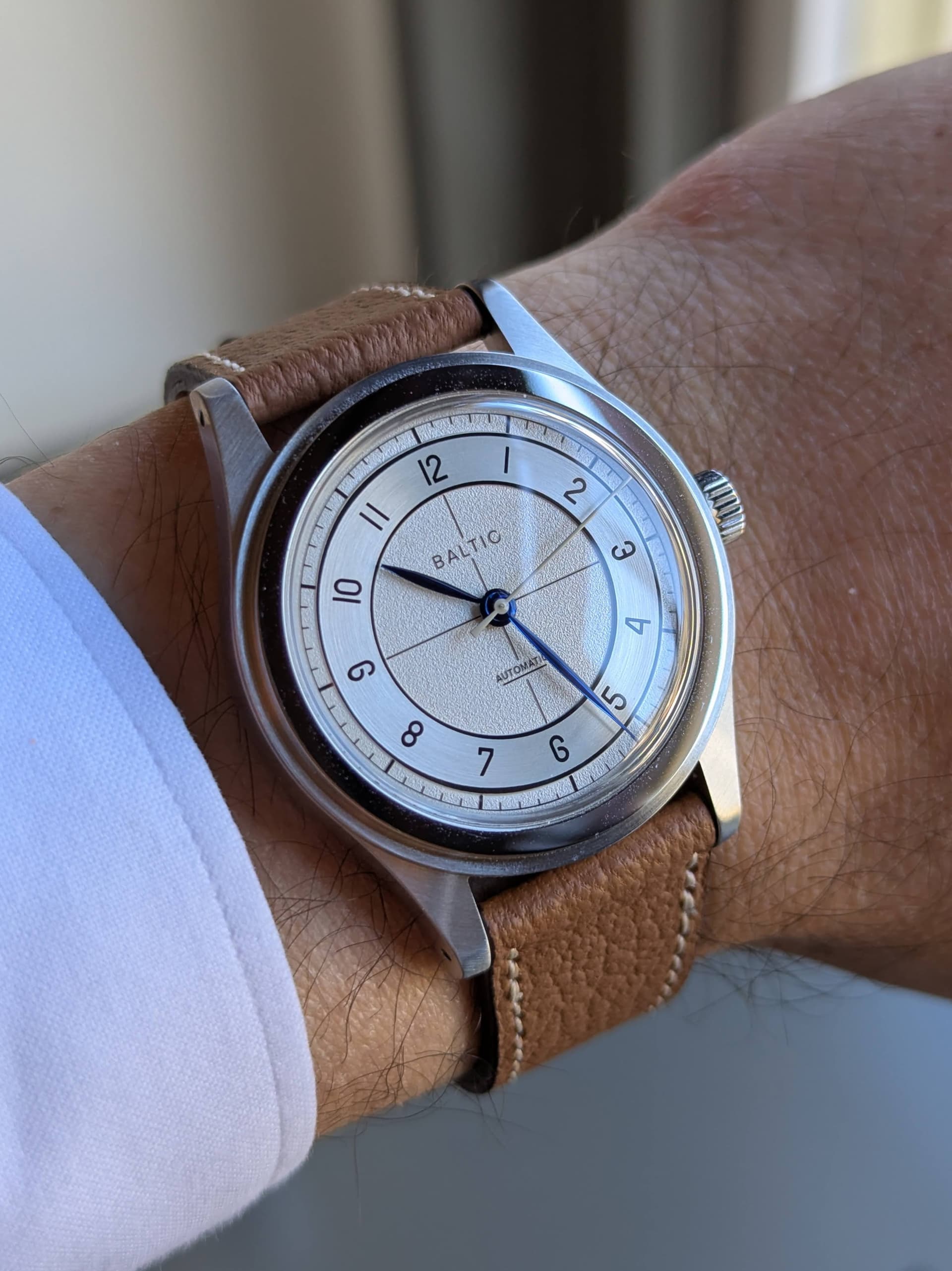 Het horloge werd geleverd in een mooi reisetui, met een poetsdoek en twee banden (zwart leer en grijs epsom). Ik heb 'm op een grijze suede band gezet, die ik erg mooi vind staan i.c.m. de kleur van de wijzerplaat.