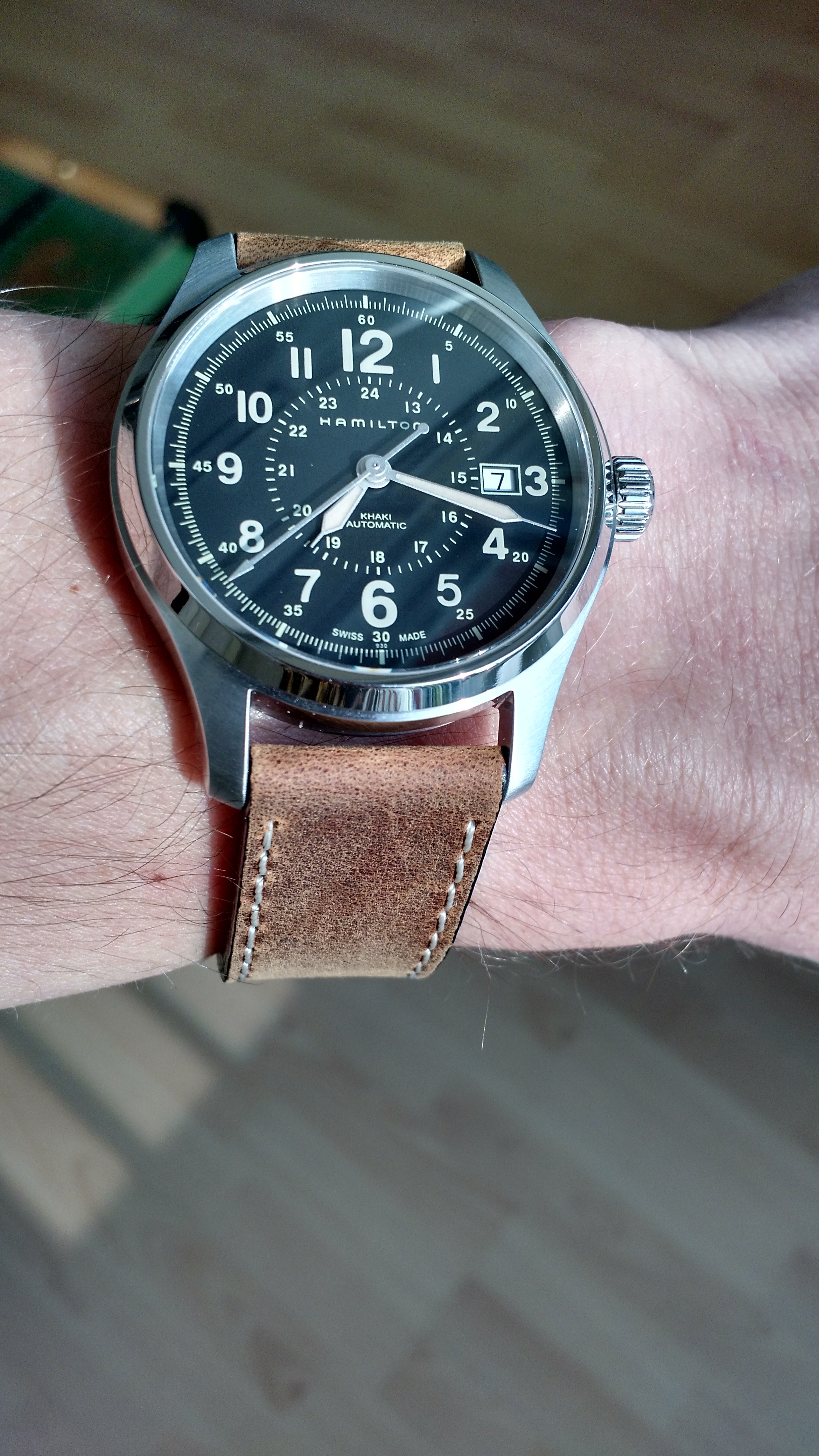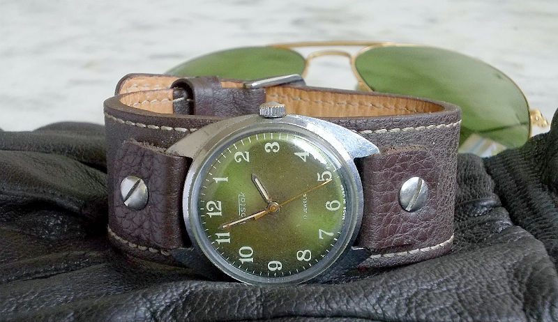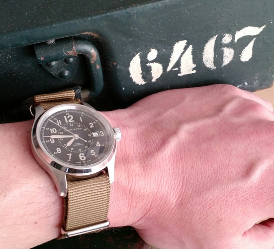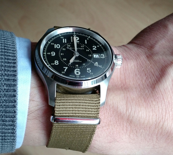 Olijfgroene NATO binnen. Nu komen die leem/beigekleurige wijzers en indices pas echt tot hun recht.