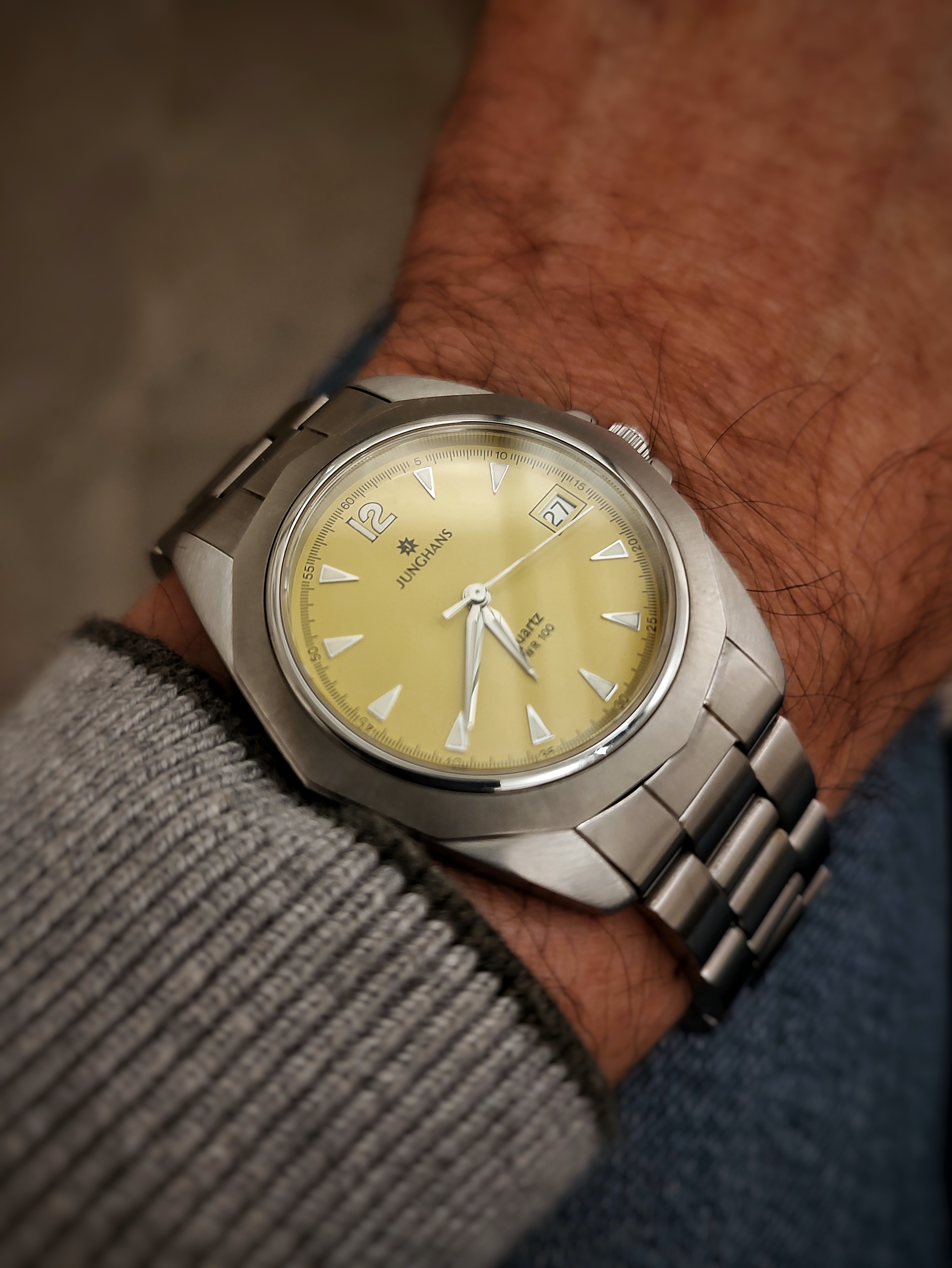 Het design is niet echt in lijn met de minimalistische stijl waar Junghans vooral om bekend staat. Toch heeft het ontwerp een link met de historie van het merk; de twaalfzijdige bezel lijkt geïnspireerd op de bezel van het J88 pilotenhorloge wat Junghans in de jaren '60 aan de Duitse luchtmacht leverde. De hoekige kast en bezel doen met wat fantasie een beetje Genta-achtig aan, al doet het hele ontwerp me nog het meest denken aan hoe TAG Heuers er tot een paar jaar geleden uitzagen.