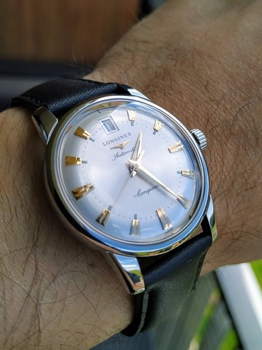 Ik had ‘m al even laten zien, maar dit horloge verdient absoluut een eigen NA topic. Deze aanschaf is het resultaat van mijn zoektocht naar de -voor mij- perfecte dress watch. Ik dacht dat ‘m gevonden had in de Orient Star Classic. Nadat de eerste liefde bekoeld was begon ik toch te twijfelen; 38,5 mm is op papier een mooie maat, maar ik praktijk vond ik het horloge te groot dragen voor een dresser. Ongeveer op het moment dat ik begon te twijfelen kwam er wat extra horlogebudget beschikbaar, dit deed me besluiten de Orient Star op het blauwe gedeelte te zetten en een stapje hoger te gaan shoppen. In eerste instantie was ik voor de Orient gegaan omdat ik het horloge me deed denken aan een ander horloge wat ik erg mooi vind; de Longines Flagship heritage. Aangezien deze ook 38,5 mm in diameter is en ik niet twee keer dezelfde fout wilde maken kwam ik uiteindelijk bij de Longines Conquest Heritage ref. L1.611.4.75.2 uit.