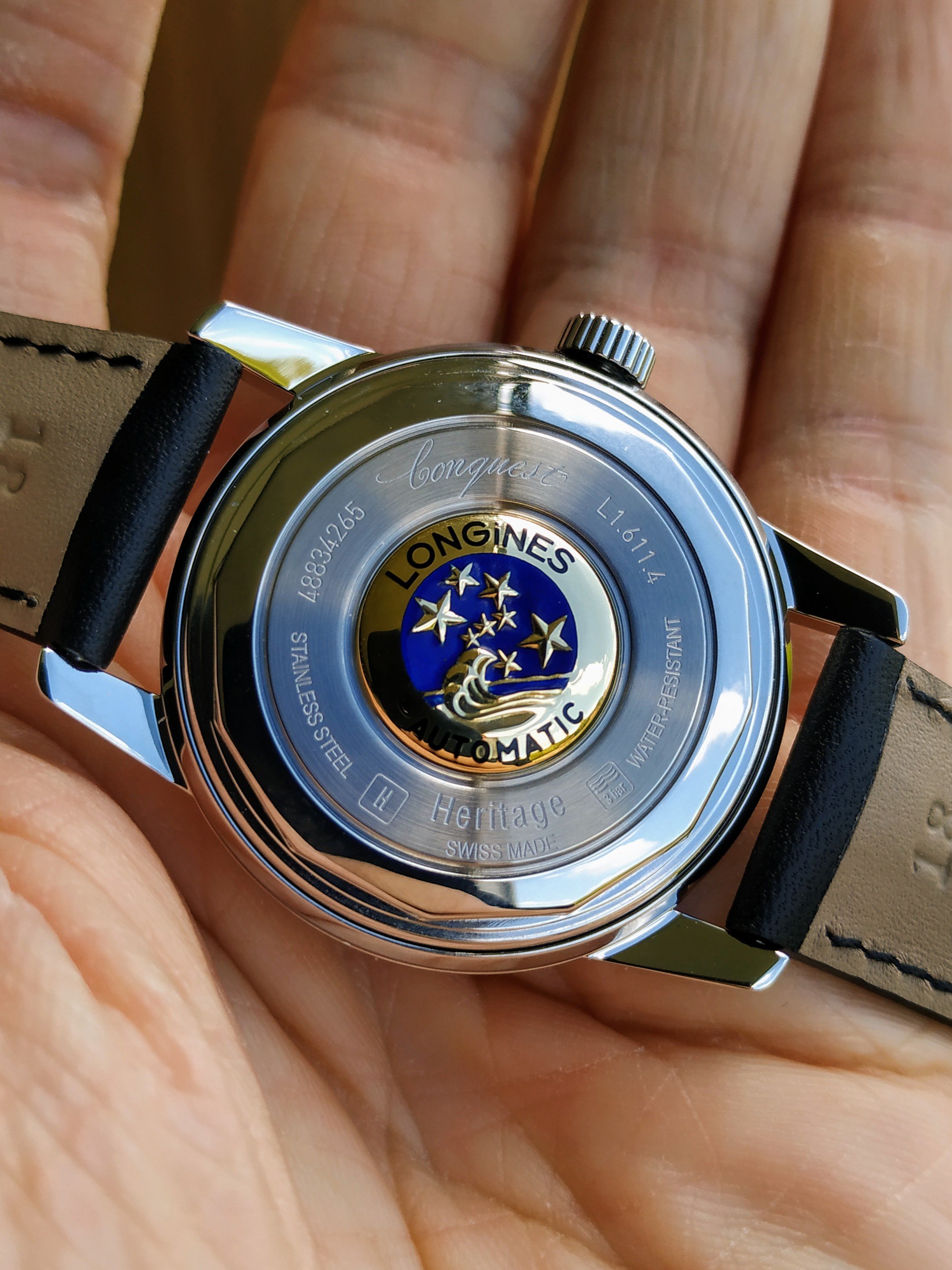 Wat ik erg gaaf vind is dat Longines het heeft aangedurfd om met dit Heritage model heel dicht bij de Conquests uit de tweede helft van de jaren ’50 te blijven. Zo meet de diameter slechts 35 mm en is het ‘glas’ gebold hesalite. Verder zijn de pie-pan wijzerplaat en de gouden gefaceteerde indexen duidelijke verwijzingen naar de 50’s. Ik had graag gezien dat de Heritage net als het origineel een manufacture uurwerk had, helaas is het Longines L633 uurwerk wat in de kast tikt ‘gewoon’ een ETA 2824-2 (élaboré) met een Longines rotor.