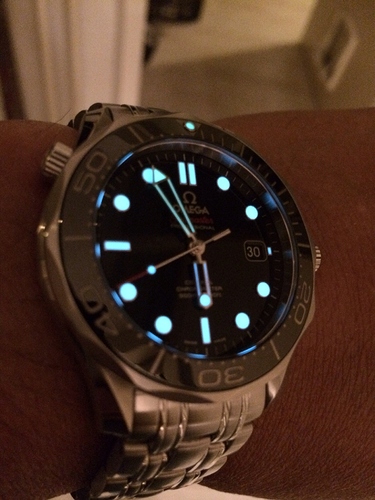 Hele tijd draaien en kijken naar pols en spiegel. Ik begon 't steeds mooier te vinden. Om toch ook de blauwe versie te kunnen vergelijken, legde hij er een blauwe Seamaster Chronograph naast.