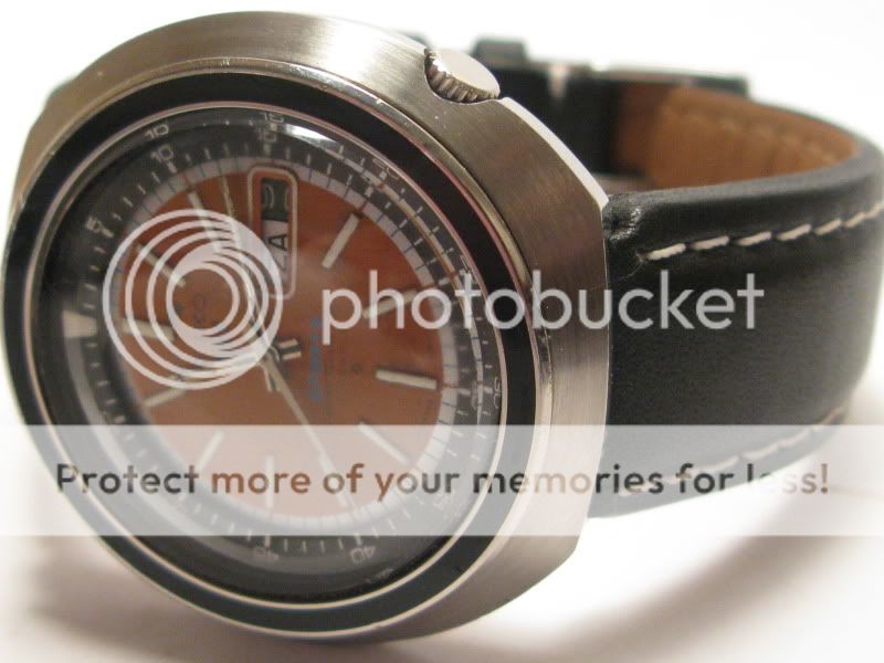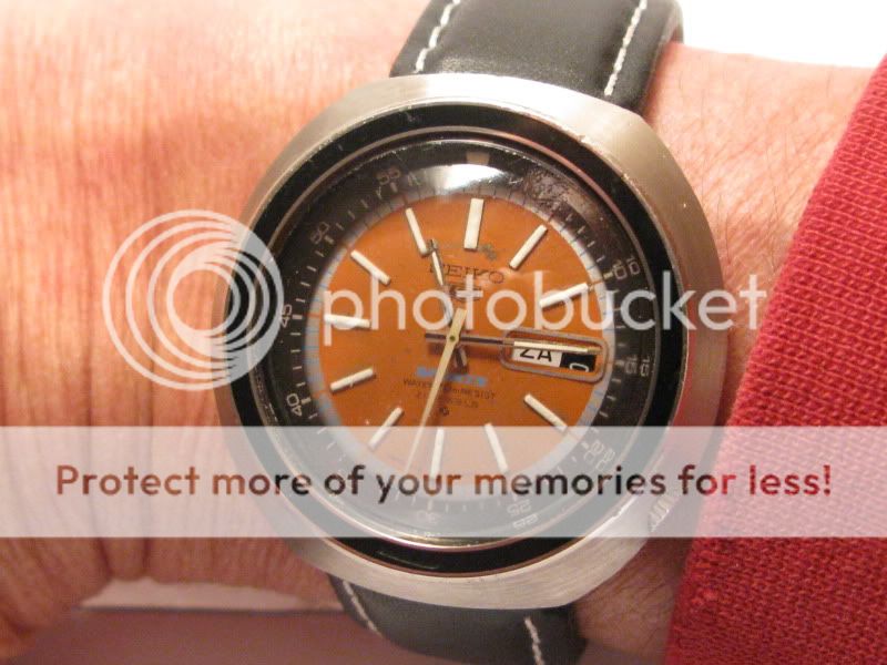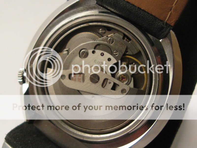Een lang verhaal kort gemaakt: Rob heeft na lang zoeken een compleet werkend horloge door de Kerstman vanochtend hoogstpersoonlijk laten bezorgen en me een onverwachts zeer gewaardeerd kerstkado gebracht. Meteen een mooie zwarte lederen band erbij gezocht en hij snort als een zonnetje om mn pols. Een mooier einde van het jaar kan ik me niet wensen. De fotos die ik net bij kunstlicht heb gemaakt laten eea van zn pracht zien. Het 6119 caliber is een van de beste calibers van Seiko, de 6138 en 6139 als zelfs de 6309 en de huidige 72s6 stammen van dit prachtig geengineerde automatisch uurwerk af, en het woord plastic bestond nog niet gelukkig…