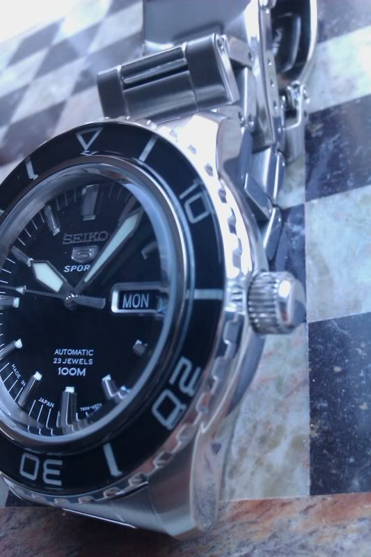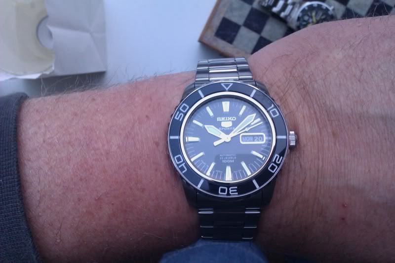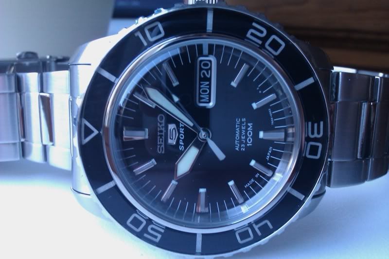 Na enkele weken eindelijk bericht van Rob: Het horloge was onderweg. Vandaag kwam de pakjesman en kon ik het horloge eindelijk in levende lijve bewonderen. Iedereen kan wel zien waarop het horloge is geinspireerd, vandaar ook zijn bijnaam de Seiko Fathoms. Wat vooral opvalt is het gebolde glas wat vrij apart is voor een Seiko uit de 5 sport serie. Wat verder opvalt is de bezel. Deze lijkt wel van glas. Waarschijnlijk is het een soort acryl. Verder heeft het horloge een prachtige wijzerplaat. Op het eerste gezicht lijk het zwart maar in wat meer licht krijgt de plaat een prachtig grijs sunburst effect. Ook valt de zwarte datumschijf op. Past veel beter bij het horloge dan de witte. Ook de band is zeer solide en voelt goed aan.