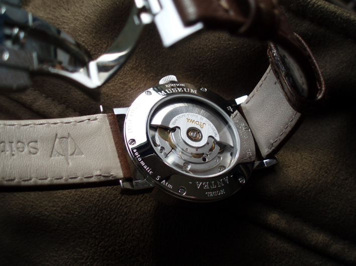 In een prachtig stalen kistje met papieren (garantie nog tot juni 2009!) lag het horloge mij aan te glimlachen, haast zonder enig spoor van dragen. Groter dan ik verwacht had en met een perfect bij het horloge passende band en een erg goed zittende vouwsluiting. De creme kleurige plaat, in combinatie met de pikzwarte wijzers en die prachtige cijfers en kast… helemaal prachtig!