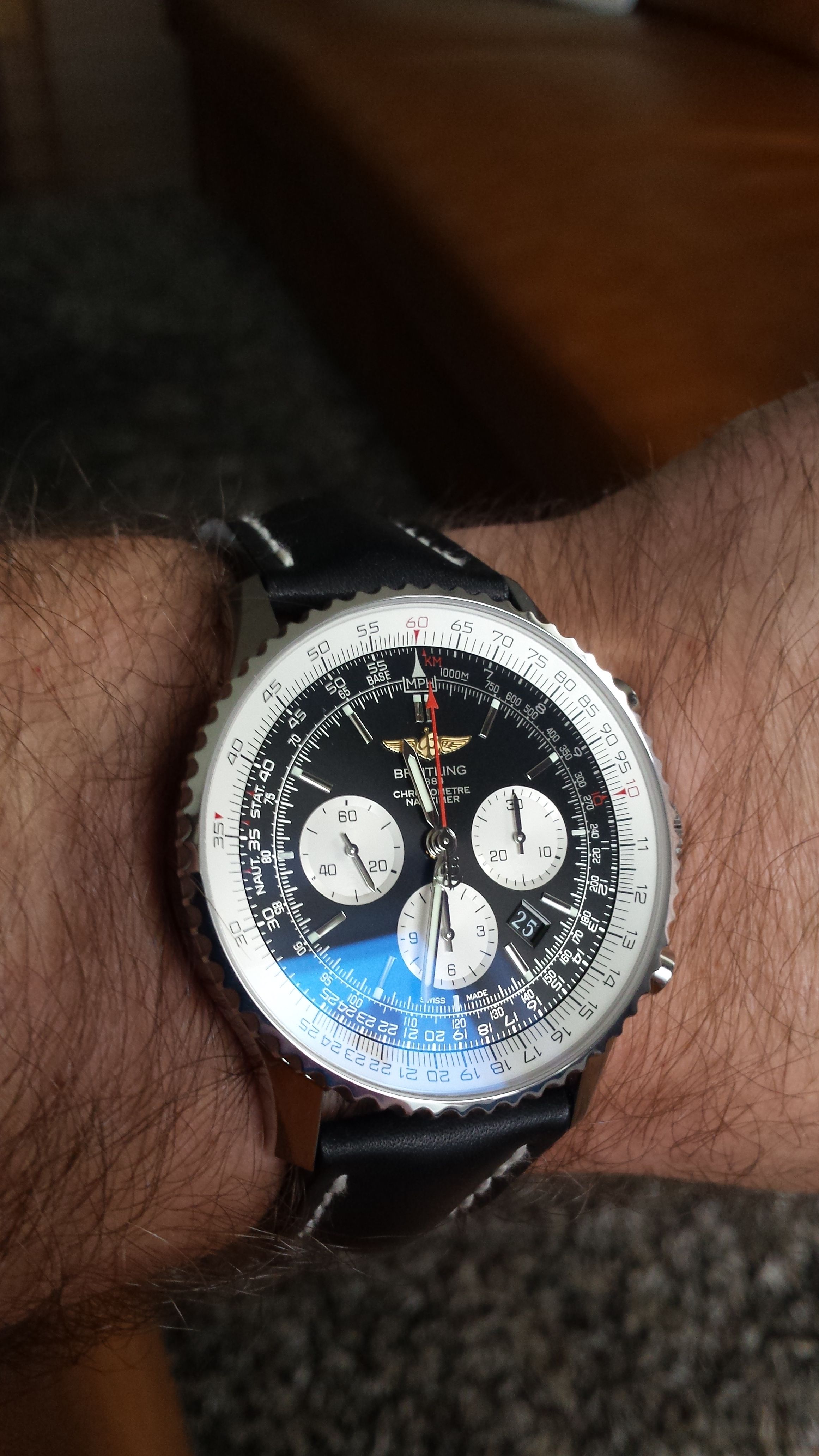 Had vanaf dat ie uit was deze navitimer willen hebben mooiere wijzerplaat dan de word het 01 uurwerk en zichtbodem. Nu lekker genieten iedereen fijne dagen gewenst