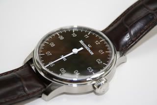 Vanochtend bij Willegen in Rotterdam heb ik eindelijk dan mijn Meistersinger aangeschaft! Het betreft een nieuwe No.1 met een chocoladebruine wijzerplaat. Het is een glimmende plaat, dit maakt het lastig om het op de foto vast te leggen, maar het lijkt op de eerste wel gelukt.