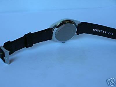) en ik ging weer op oude manier verder om aan een werkend stemvorkhorloge te komen. op het moment dat het eigelijk niet uitkomt (dure decembermaand enzo…) kwam deze onderstaande nos certina langs. met de genoemde decembermaand in het achterhoofd een naar mijn idee niet te hoog bod neergelegd. tot mijn grote verrassing won ik ook nog, zelfs een tientje onder m’n uiterste prijs… 't is eenzelfde kaliber als de tissot maar deze zoemt vrolijk en wijkt een minuutje ofzo af in de week… ik ben nooit zo precies met dat soort dingen… feit is in ieder geval dat ik de laatste week niets anders om heb en meer reacties op deze heb gekregen als op m’n ariadne… en dan nu de foto"s… 't zijn de foto"s van de verkoper, ik zal me nog wel eens wagen aan een wrist shot maar heb dat nu niet voorradig…