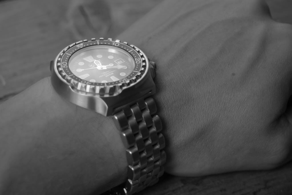 Impact, Aqualung, Poseidon, Meister Anker etc.: forse klok, veel groter dan een normale men’s size (bezel 48 mm, totale kastbreedte incl. kroon 50 mm of zoiets). Erg accuraat Miyota uurwerk en zeer degelijk. Great looks heeft wel iest weg van een Seiko Tuna Can. Bij deze een paar foto’s van de mijne die ik onlangs heb laten relumen (van groene naar witte lume) en de wijzers heb laten witten. De rubberen band die er origineel aan zit is soepel, satijnachtig en voelt goed (daar kan Seiko nog van leren). Deze klokken zijn niet zo duur: true value for the money: