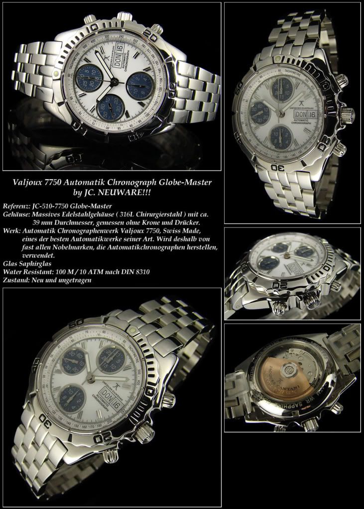 Wat betreft die horloges die op ebay staan met de Valjoux 7750. Ik vind ze, en vooral de Invicta, persoonlijk erg lelijk en je zal bij de eerste en de derde moeten uitkijken dat je niet een Aziatische versie van de Valjoux 7750 krijgt.