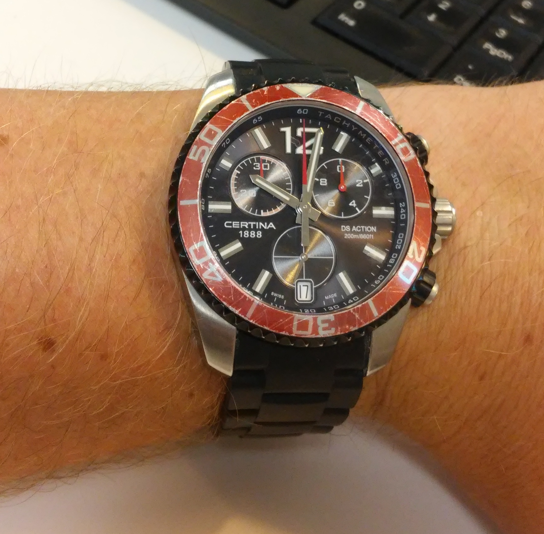 De bezel van mijn Certina DS Action chrono is flink beschadigd. Dit komt omdat ik dit horoge graag draag naar mijn werk. Hierdoor kan er een keer een krasje opkomen. Nu na een paar jaar is het tijd voor een nieuwe bezel.