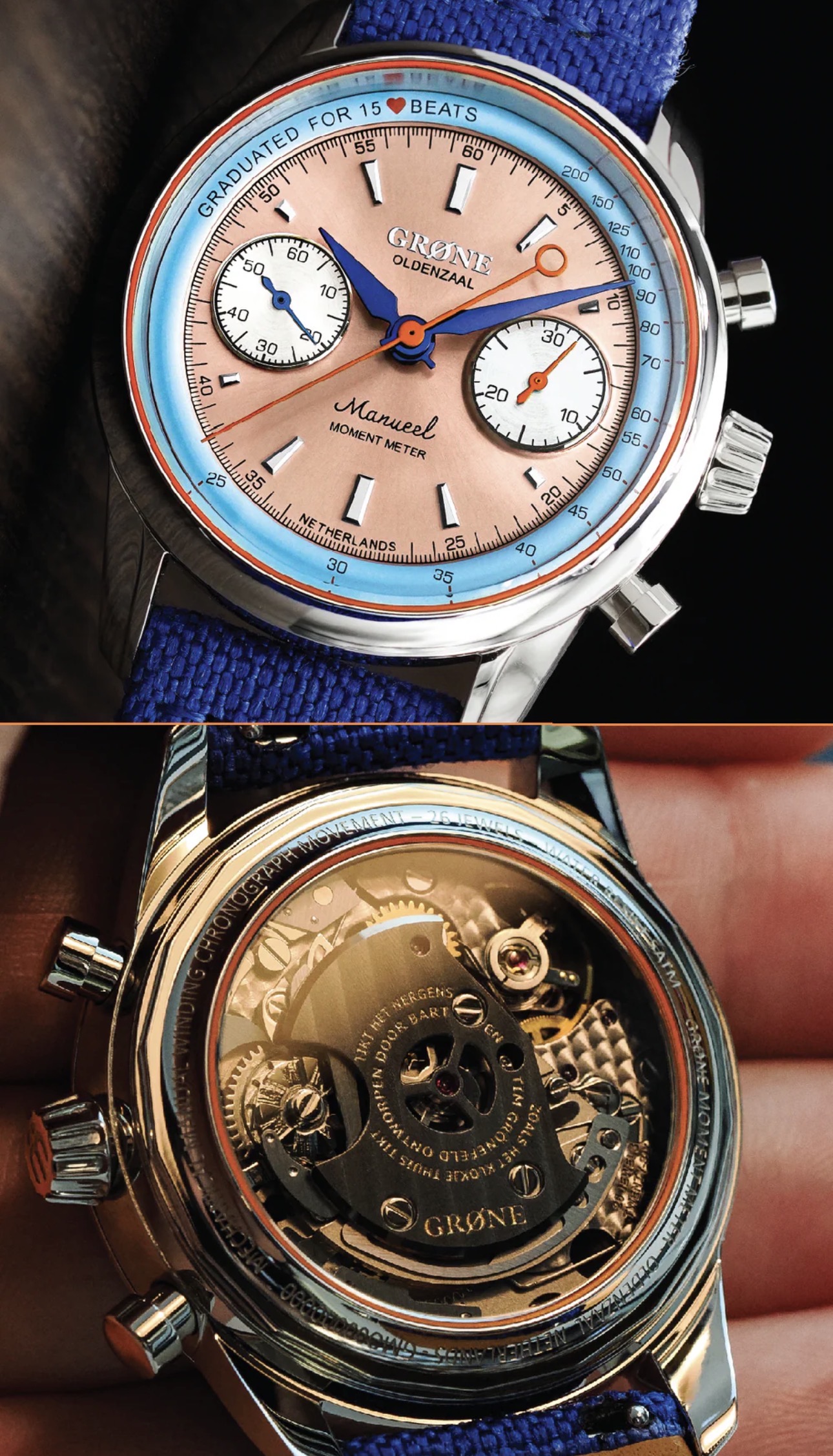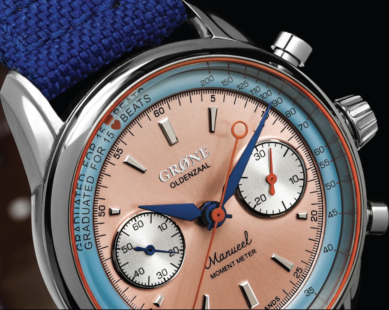 Grøne uit Oldenzaal en kleine broertje van Grønefeld heeft zojuist hij tweede model aangekondigd. De Grøne Manueel Moment Meter. Een chronograaf horloge met gemodificeerd handopwinder uurwerk La Joux-Perret. Prijs 3490 euro ex BTW. Gelimiteerd op 300 stuks.