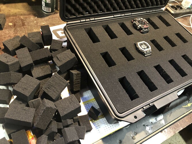 Uit de tijd dat ik alleen nog maar mee las, kwam ik ook regelmatig op WUS terecht. Daar zag ik Peli cases die men gebruikte om horloges in op te bergen. Ook erg gaaf! Makkelijk mee te nemen, maar is dat een vereiste? Nee. Ook een mogelijkheid om een ring in op te bergen, omdat je hem zelf in kan delen. Het aantal van 12 horloges lukt niet in deze case en ik vraag me af of het plukfoam stevig genoeg is als horloge kussen. Prijstechnisch ook gelijk richting het maximale, dus andere kussen zijn geen mogelijkheid.