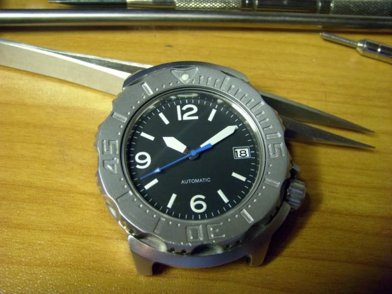 Hier het exemplaar met het nieuwe saffierglas en secondewijzer. De andere veranderingen waren eerder al aangebracht. Afgezien van het uurwerk is er nu niets meer origineel:D