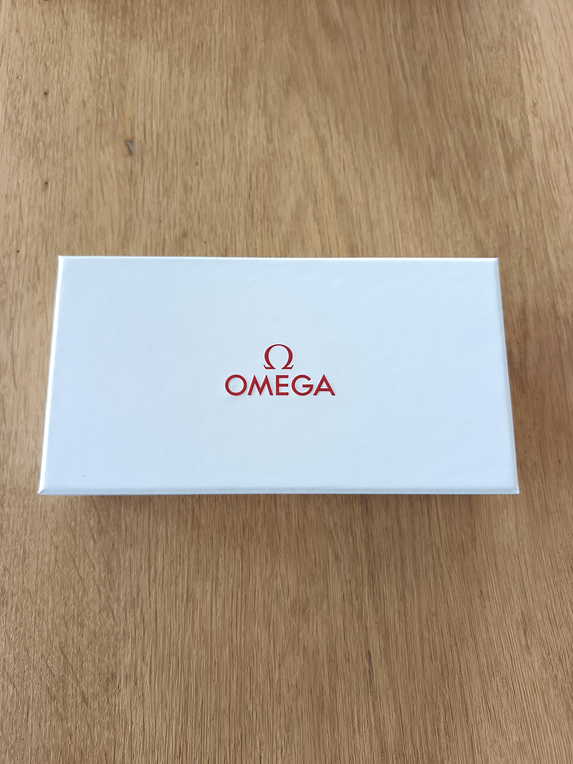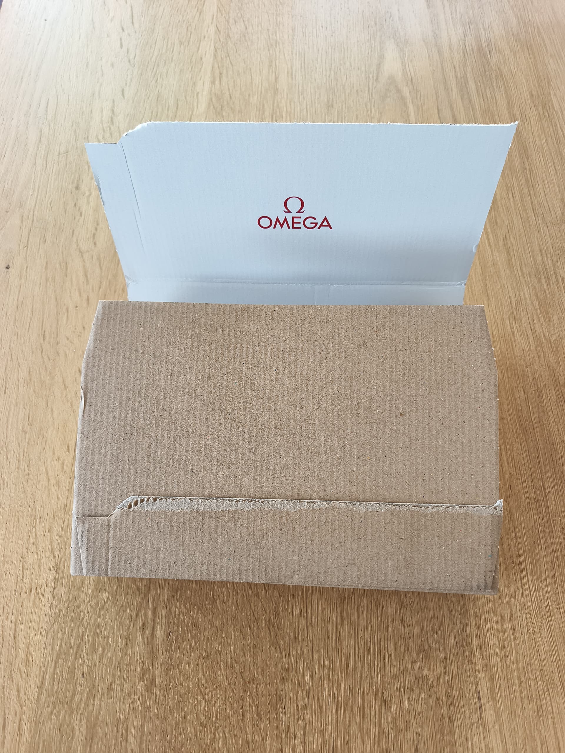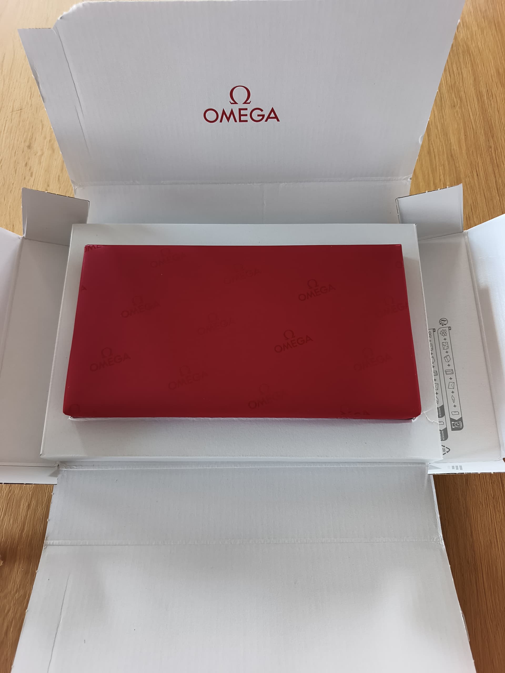 Een zeer luxe verpakking die begint als je de bruine karton open klapt en een mooie witte binnenkant ziet met het rode Omega logo.