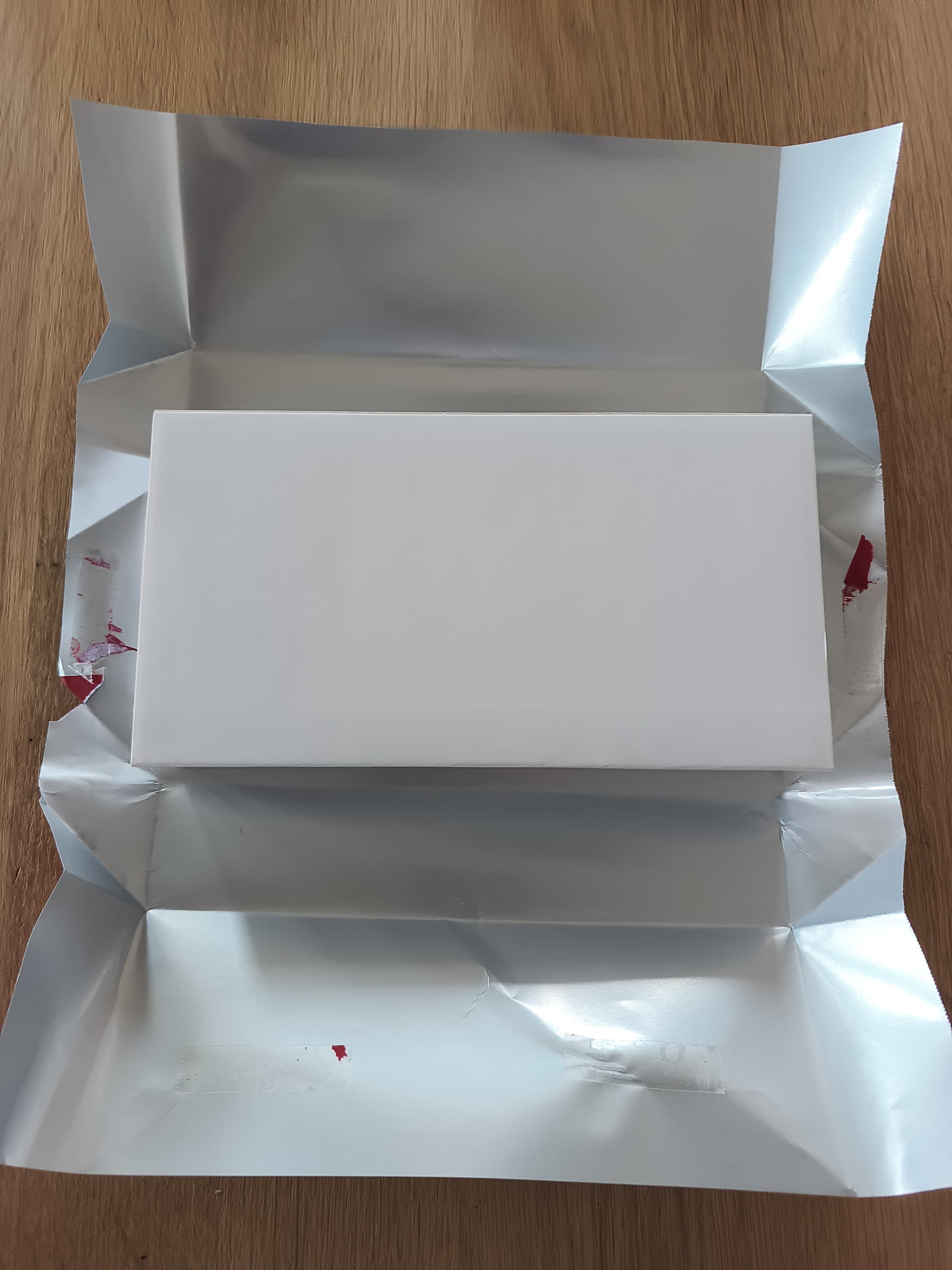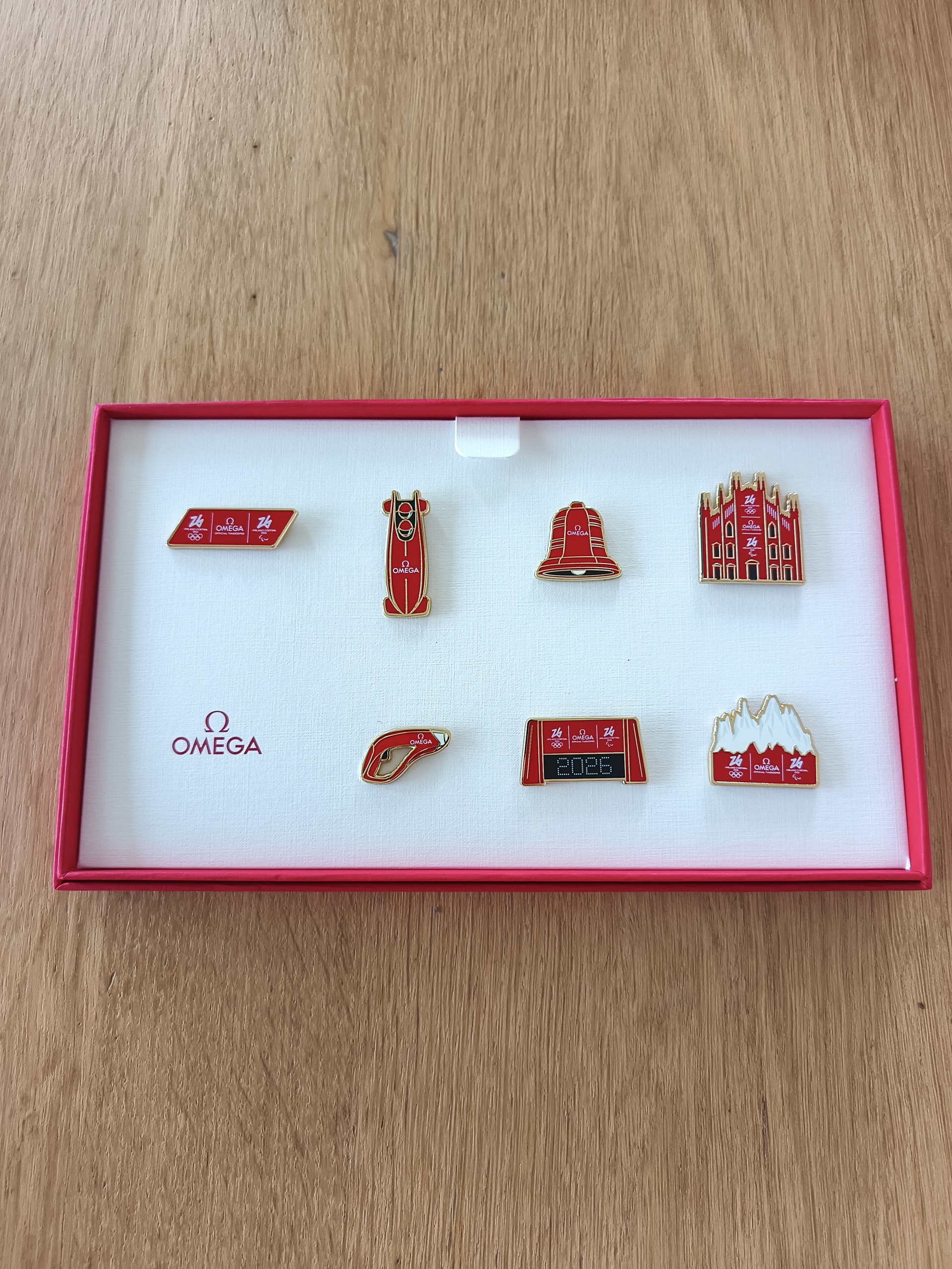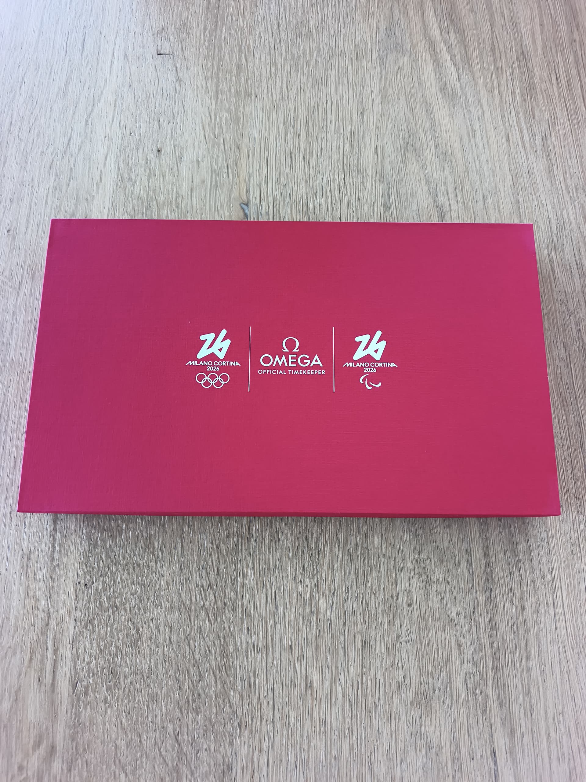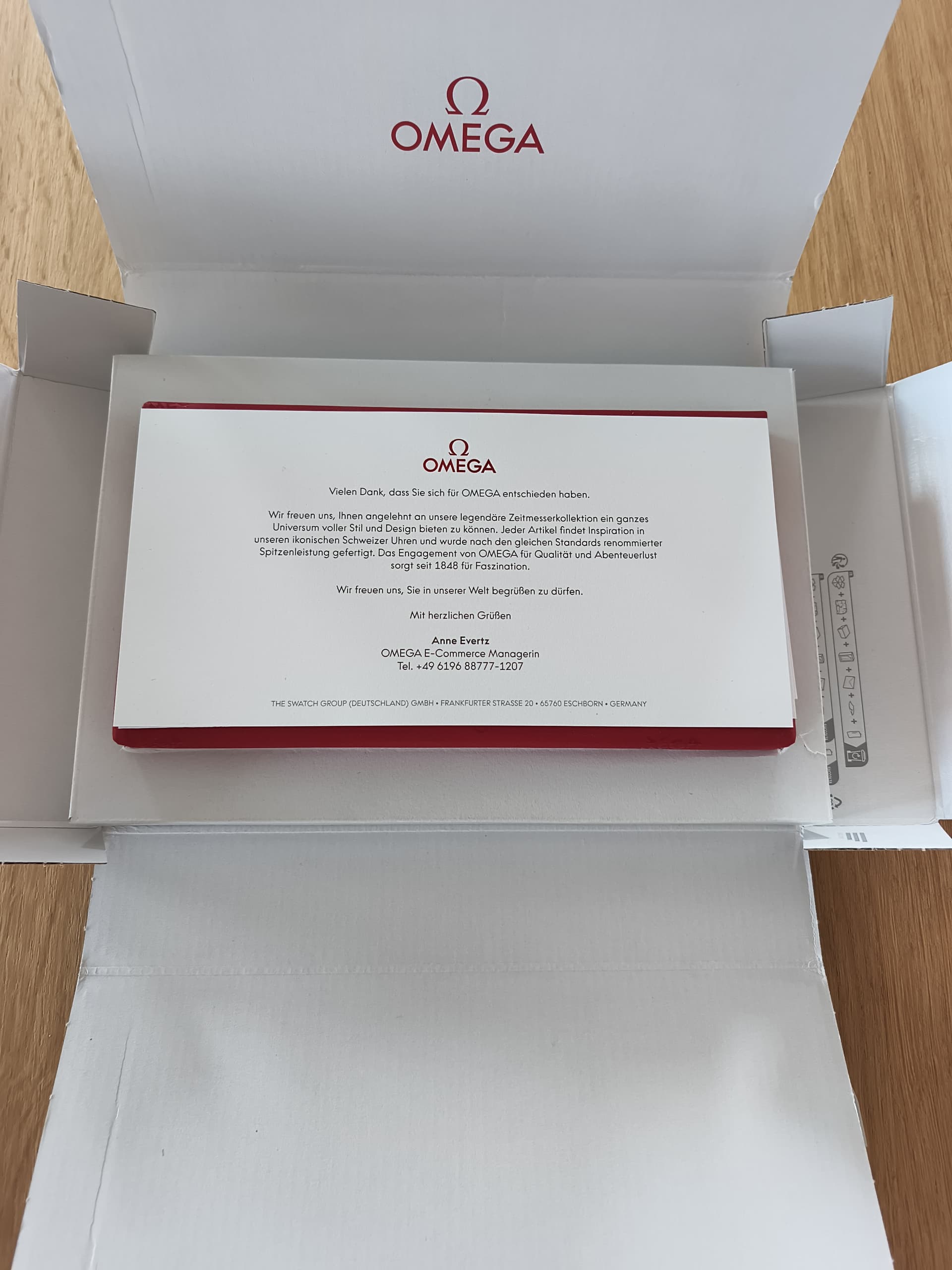 Een zeer luxe verpakking die begint als je de bruine karton open klapt en een mooie witte binnenkant ziet met het rode Omega logo.