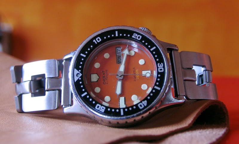 Ook nog een oud Orientje, klein voor een duiker, 40-41 mm incl. de kroon, maar hij “draagt” wat groter door de dikte,