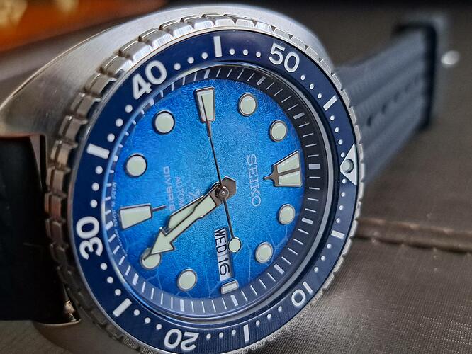 De wijzerplaat heeft exact dezelfde structuur als een US only King turtle welke ik onlangs gehad heb. Echter had de turtle nog een schildpadden print welke in select licht zichtbaar werd. Hele toffe plaat
