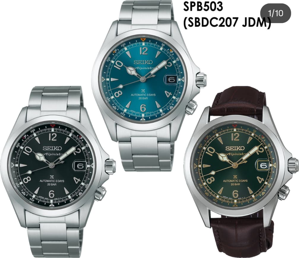 Seiko has announced three new Alpinist models, with the blue/green dialled SPB503 (SBDC207 JDM), black dialled SPB505 (SBDC209 JDM), and green dialled SPB507 (SBDC211 JDM). All models have stainless steel cases measuring 39.5 x 12.7 x 46.4mm and utilize the 6R55 automatic calibre. These models are not limited and are standard additions to the line up.