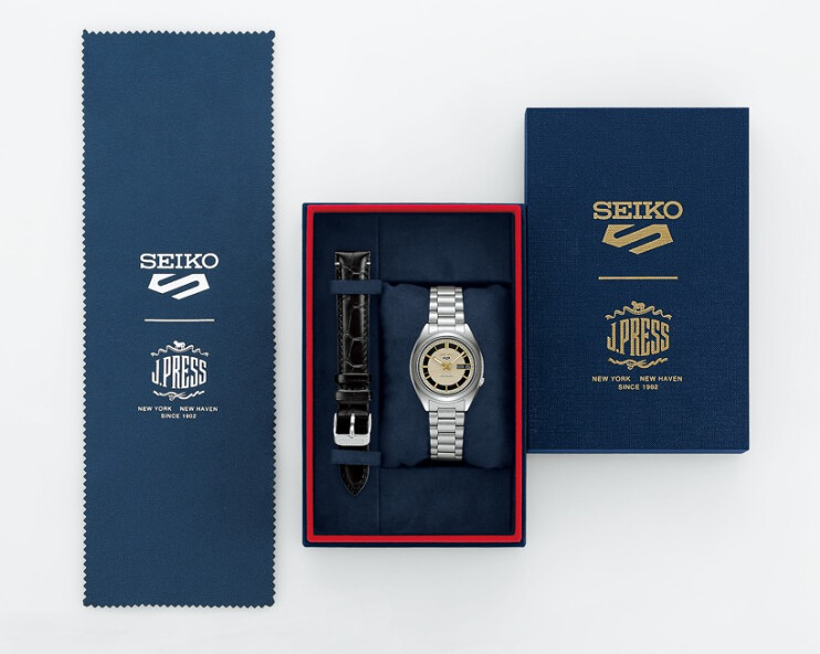 Seiko Japan has announced the Five Sports SBSA317 limited edition produced in collaboration with fashion brand J.PRESS. This has a cream dial with a very dark blue ring and golden colored hands and markers. The stainless steel case measures 37.4 x 12.5 x 44.7mm and the case back features the J.PRESS logo. It utilizes the 4R36 automatic calibre. This is a limited edition of 500 units.