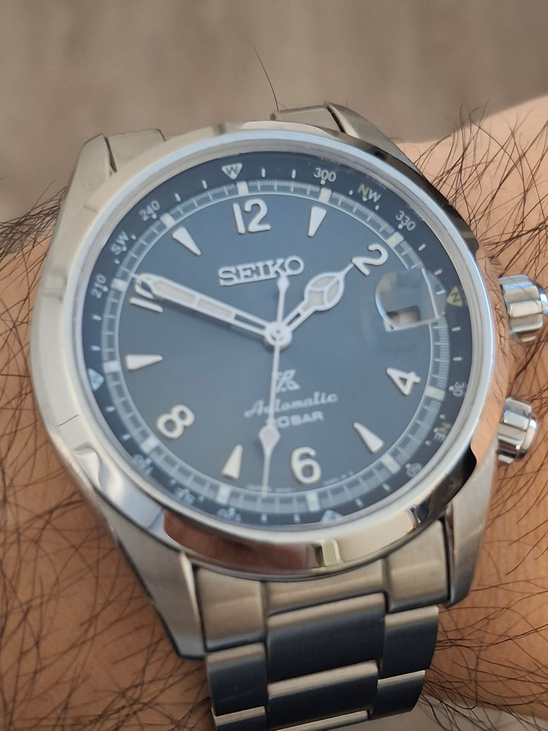 Seiko heeft zojuist de Alpinist voorzien van een update. Horloge lijkt meer op de Sarb017 Alpinist. Prospex logo is kleiner geworden. Nu voorzien van de tekst Alpinist op de wijzerplaat. Zwart datum venster net zoals de Sarb017. Meer gilt accenten nu ook op de compass ring. Inhouse Seiko 6R55 uurwerk met 72 uur power reserve. Nu met goudkleurige rotor, helaas wel met lelijke sticker op de display caseback. 200 meter water resistant. Case 39,5mm.