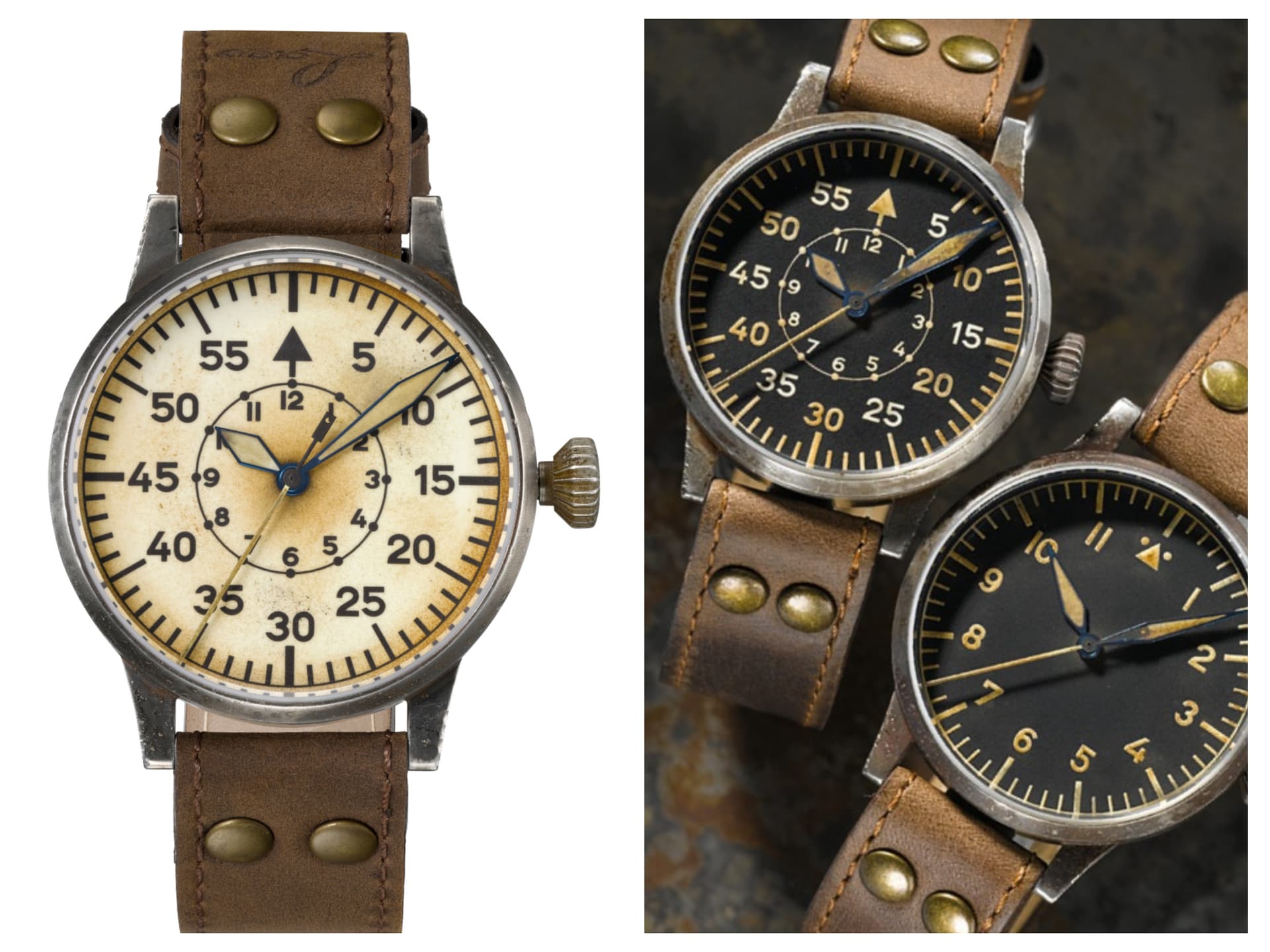 Een mooi voorbeeld zijn de Flieger horloges van de Luftwaffe. De echte uit WO2 zijn lastig te vinden, maar het naoorlogse aanbod is reuze, maar deze zijn wel aangepast wat formaat en kwaliteit betreft. Zelf zoek ik bijvoorbeeld iets dat dicht bij het origineel ligt, maar op formaat zal ik wel iets kleiners willen dan 55 mm. Laco heeft een ‘Erbstück’ lijn, die horloges zijn kunstmatig verouderd, waardoor deze de uitstraling van een schuurvondst hebben. Dat gaat mij te ver.