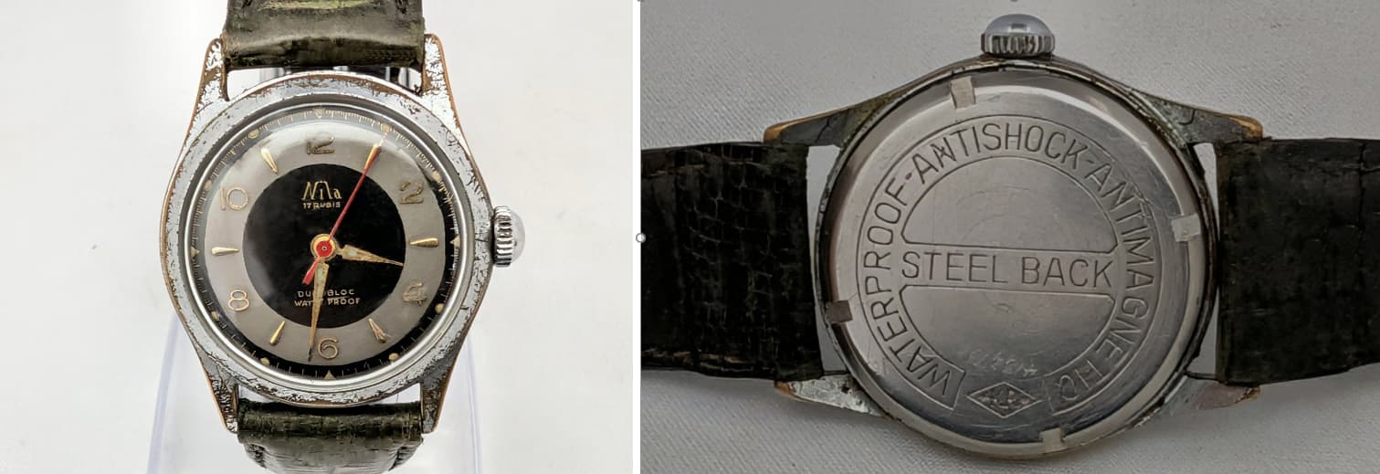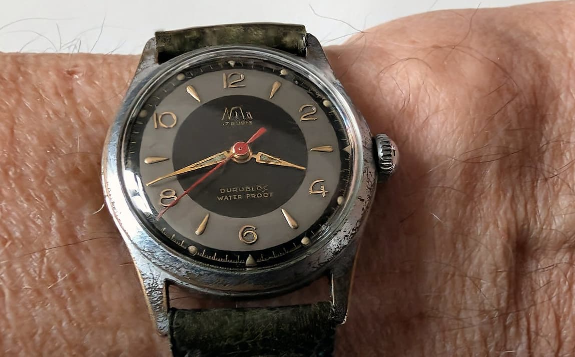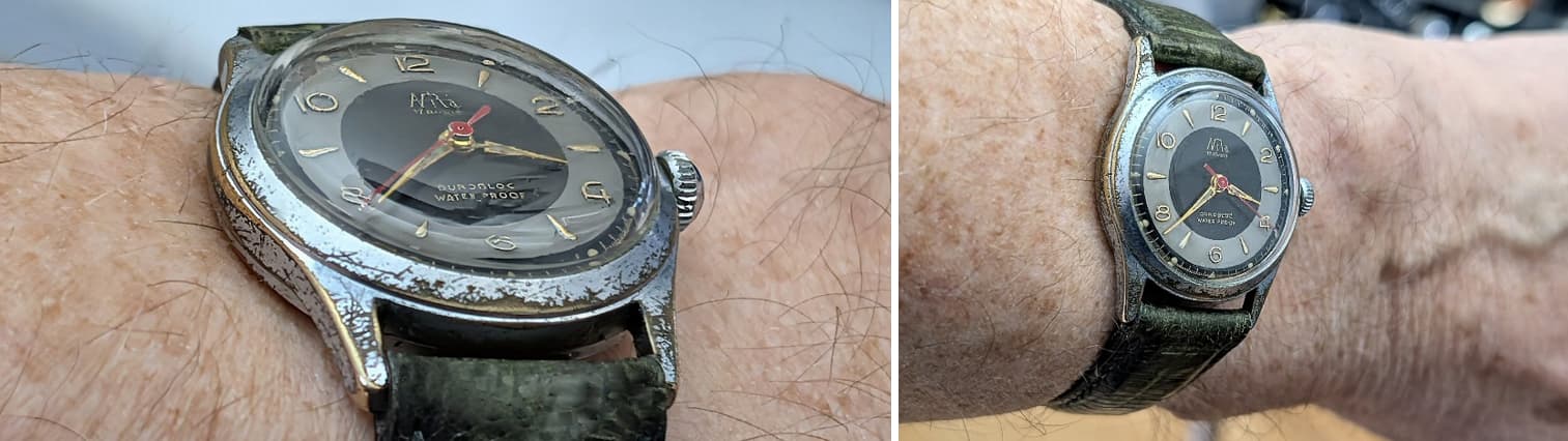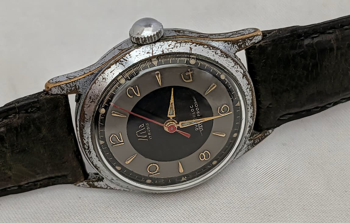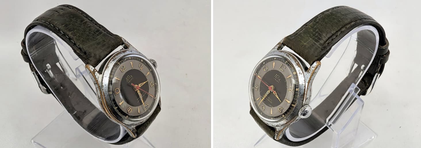 Al een paar jaar geleden heb ik eens een klein, beetje mottig horloge uit een rommelbakje bij meneer Hagman op de Rikketik beurs gevist. Kostte een paar Euro. Het lag nog alsmaar te wachten tot ik er eens wat meer achtergrondinformatie over kon vinden. Dat kan dan eindeloos blijven duren, want die informatie komt niet uit zichzelf boven water. Omdat ik momenteel bezig ben de achterstand in de documentatie van mijn horlogeverzameling een beetje bij te werken kwam het ding weer in beeld en in handen. Een goede aanleiding om er eens wat research op los te laten.