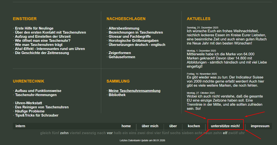 Voor veelgebruikers van deze site (zoals ik) kan het misschien geen kwaad om eens een kleine bijdrage aan Dr. Schröter over te maken, om er voor te zorgen dat de site kan blijven bestaan. Als die er niet meer zou zijn (denk aan het verdwijnen van Ranfft) zou ik me geen raad weten waar ik verder nog zoveel informatie over horlogefabrikanten zou kunnen vinden.