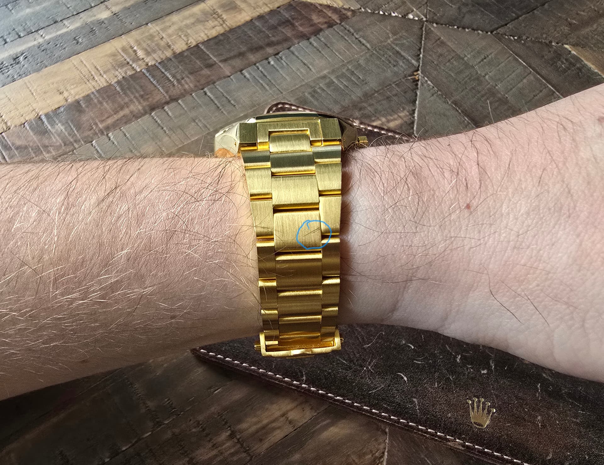 Conditie (krassen, werking etc): op de clasp zitten een paar krassen. Op de band zit een kras (deze is rood omcirkeld op foto. Deze valt echter vaak niet op in het licht.