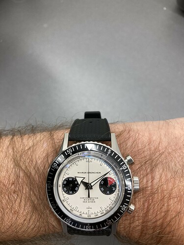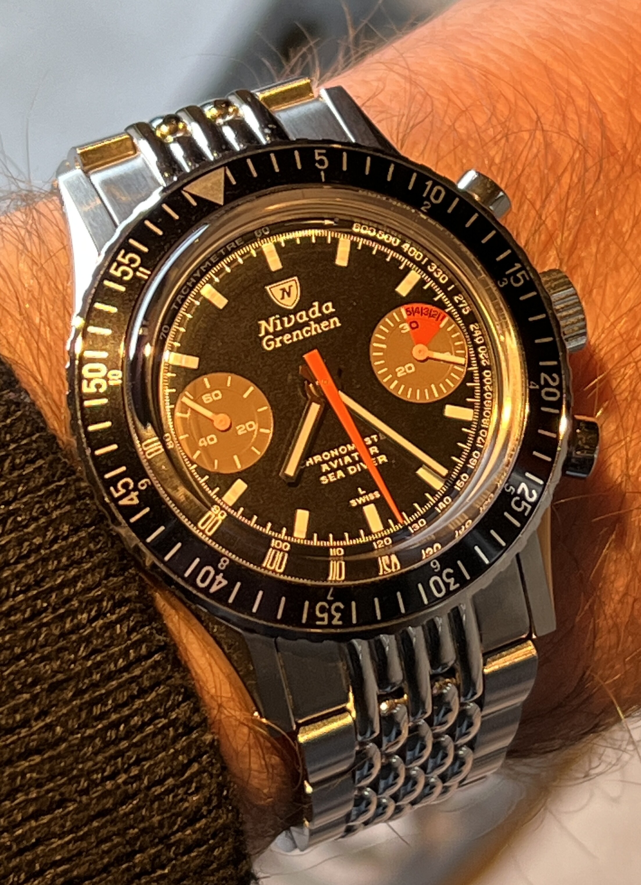 Hier mijn mooie Nivada Grenchen Chronomaster Aviator Sea Diver remake.