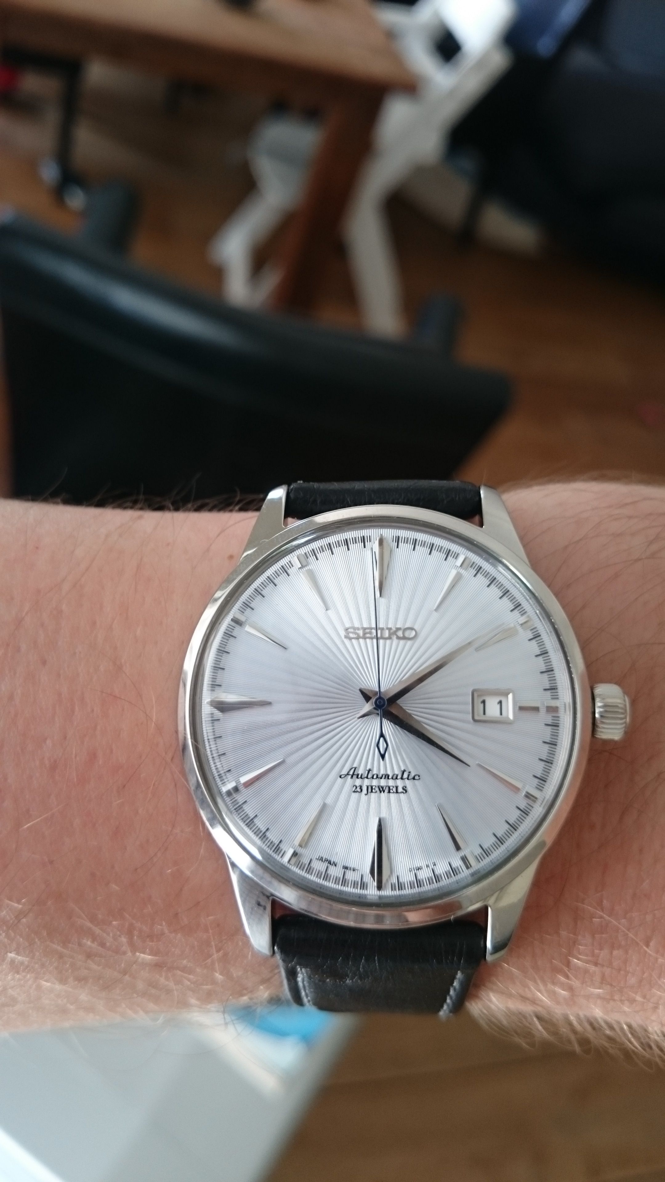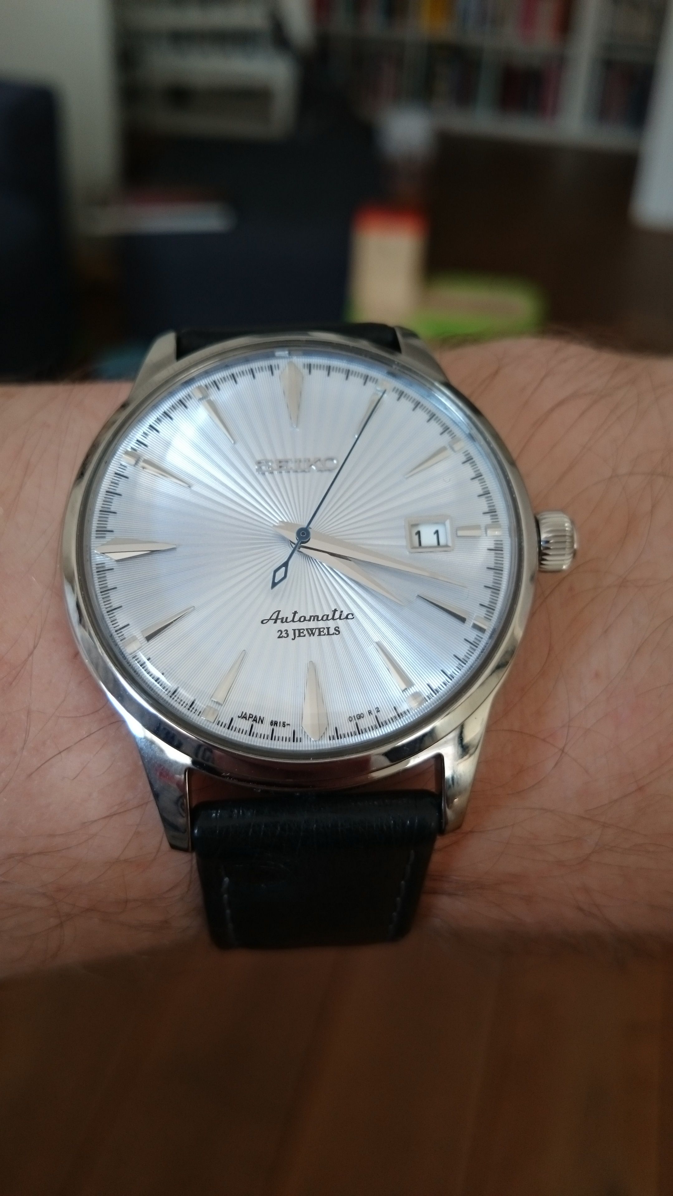 Bij Rob weer een Seiko gekocht. De tweede Seiko in korte tijd. Ik heb dit horloge op de foto nooit mooi gevonden, maar in het echt bleek ik meteen verloren. Zeer bijzondere wijzerplaat, prachtige wijzers en kast. Nu nog naar een beter bandje op zoek.