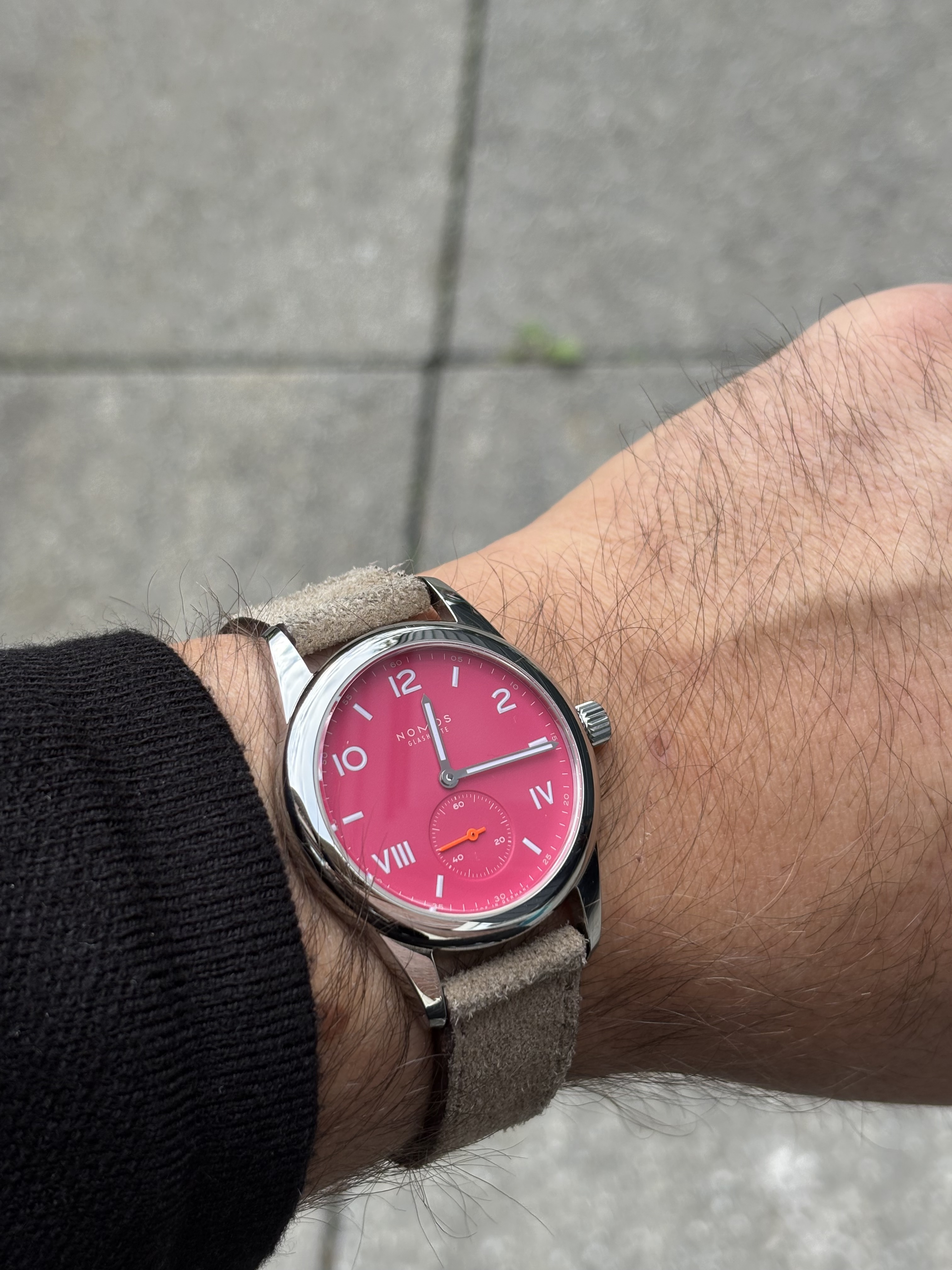 Tijd aflezen is geen uitdaging met het beperkte contrast? Verder heerlijk kleurtje wel.