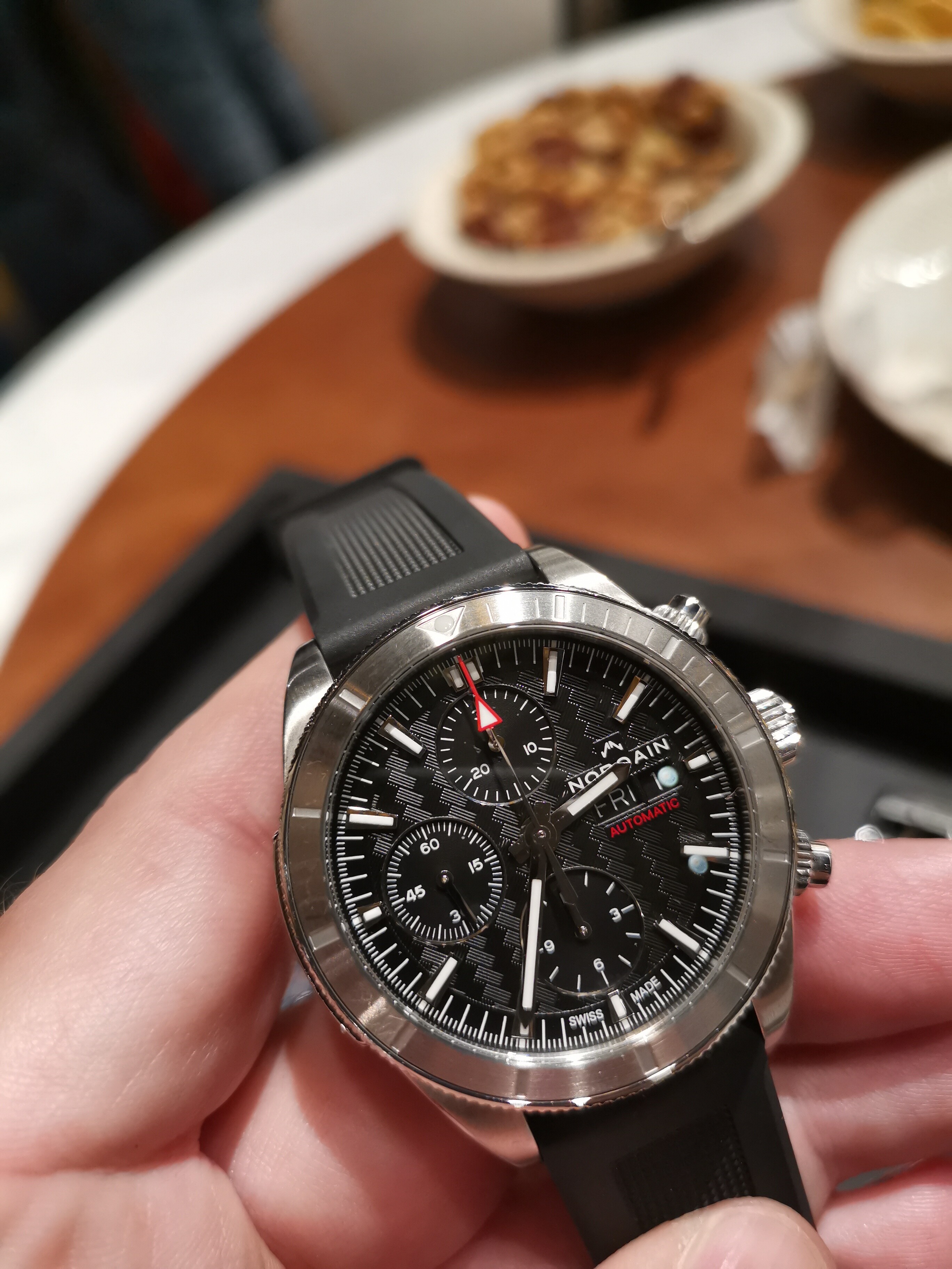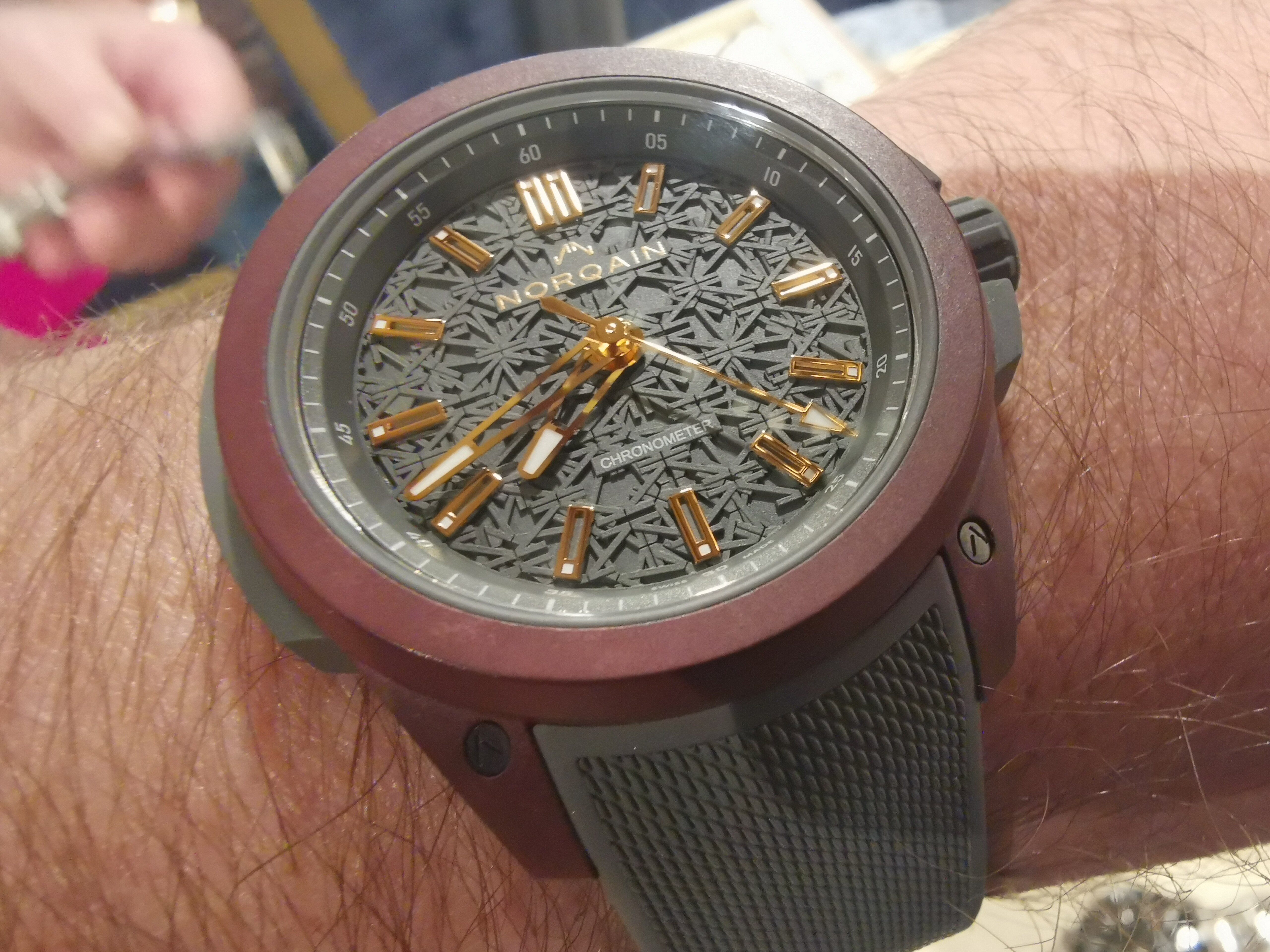 Toevallig was ik een paar maanden geleden met mijn dochter in de Westfield mall. Toen eens Van Koningsbruggen binnengewandeld om even rond te kijken. Aanvankelijk werd er weinig aandacht aan mij besteed, toen de verkoper mijn Rolex zag werd zijn interesse toch wel gewekt en kwam hij snel op mij af. Op dat moment probeerde hij mij te interesseren voor een Norqain horloge. Ik had op dat moment nog nooit van dat merk gehoord terwijl ik het horlogenieuws wel redelijk volg.