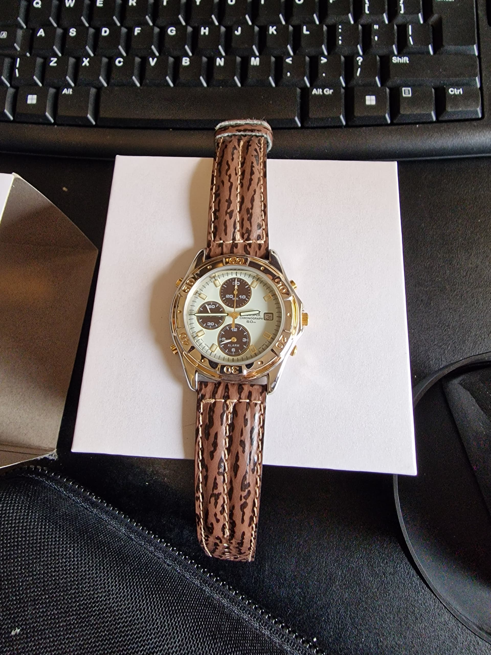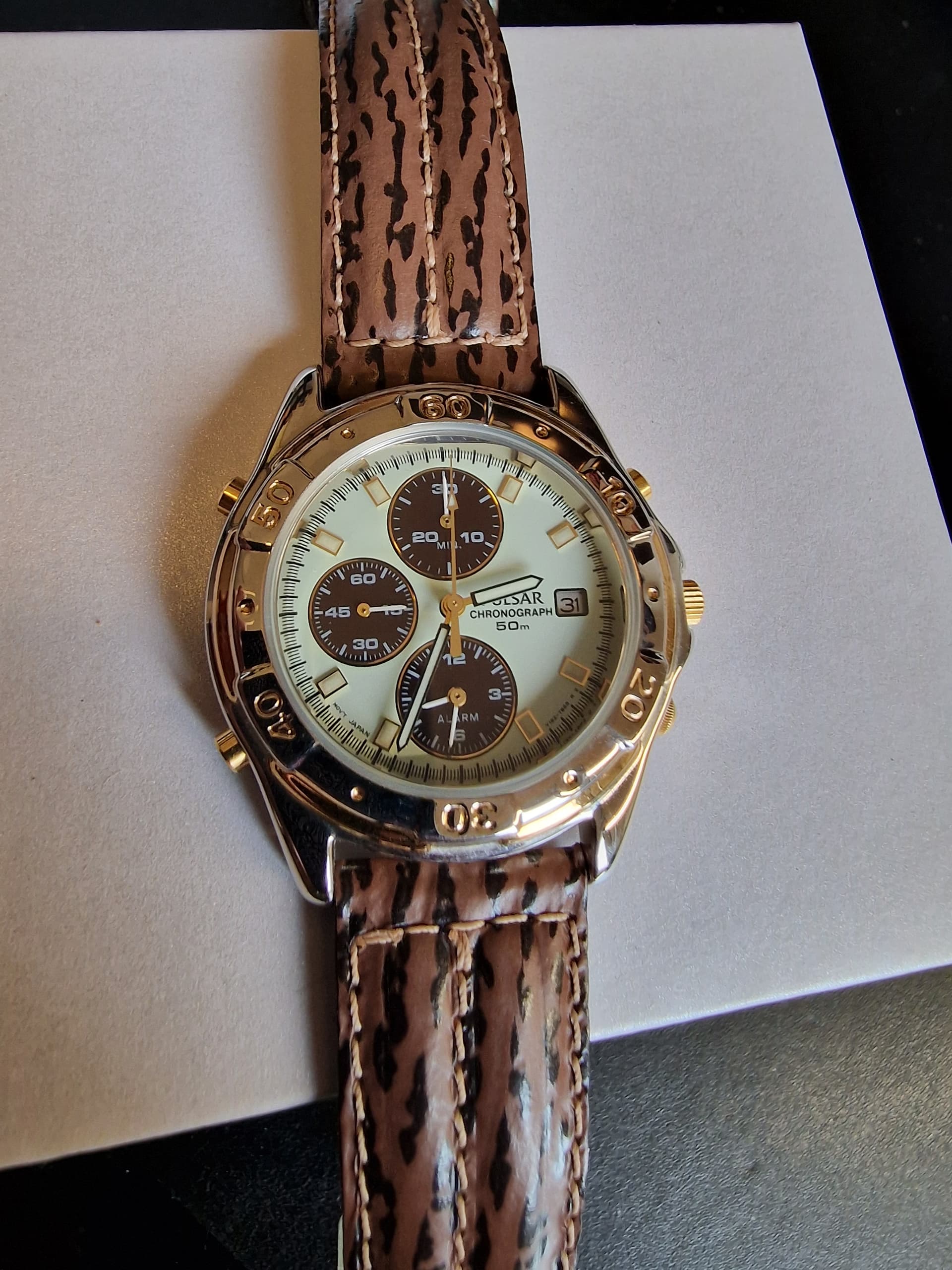 Deze leuke Pulsar vond ik enkele maanden geleden in de hoek bij een kleine lokale juwelier waar hij denk ik al heel lang lag stof te happen. Echte 90s vibe met klein formaat en two tone. Er is een nieuw batterijtje ingezet, komt inclusief fabrieksgarantie!