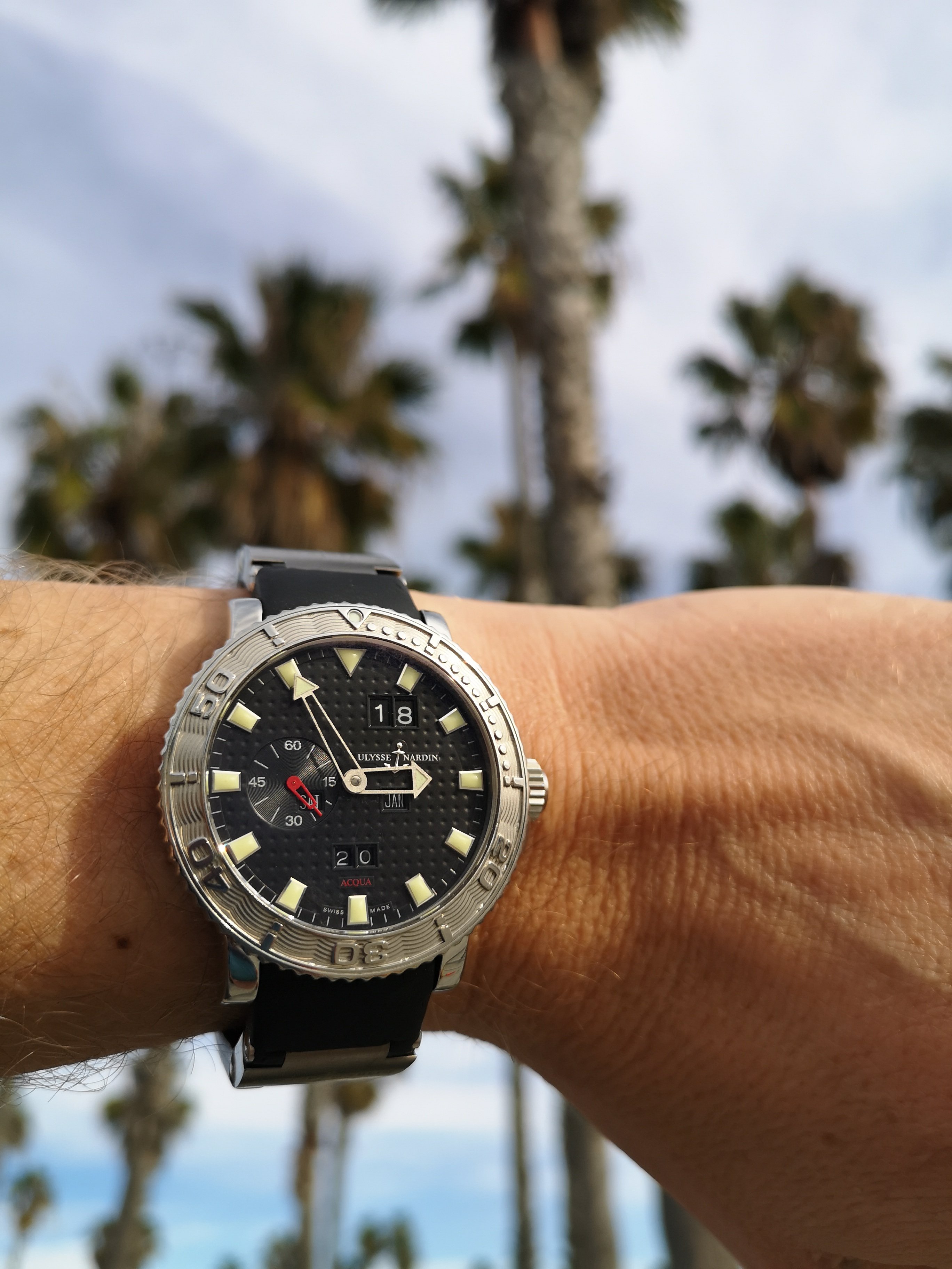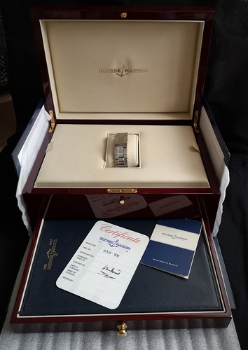 Na enig speurwerk ben ik het juiste horloge tegen gekomen de 42,7mm Ulysse Nardin Acqua perpetual calendar met het inhouse UN-33 uurwerk. Het basis uurwerk is namelijk ook ontwikkeld door Ludwig Oechslin en speciaal voor deze complicatie in samenwerking met Lemania, tegenwoordig Breguet. Het horloge laat perpetual de dag, datum, maand en het jaartal zien.