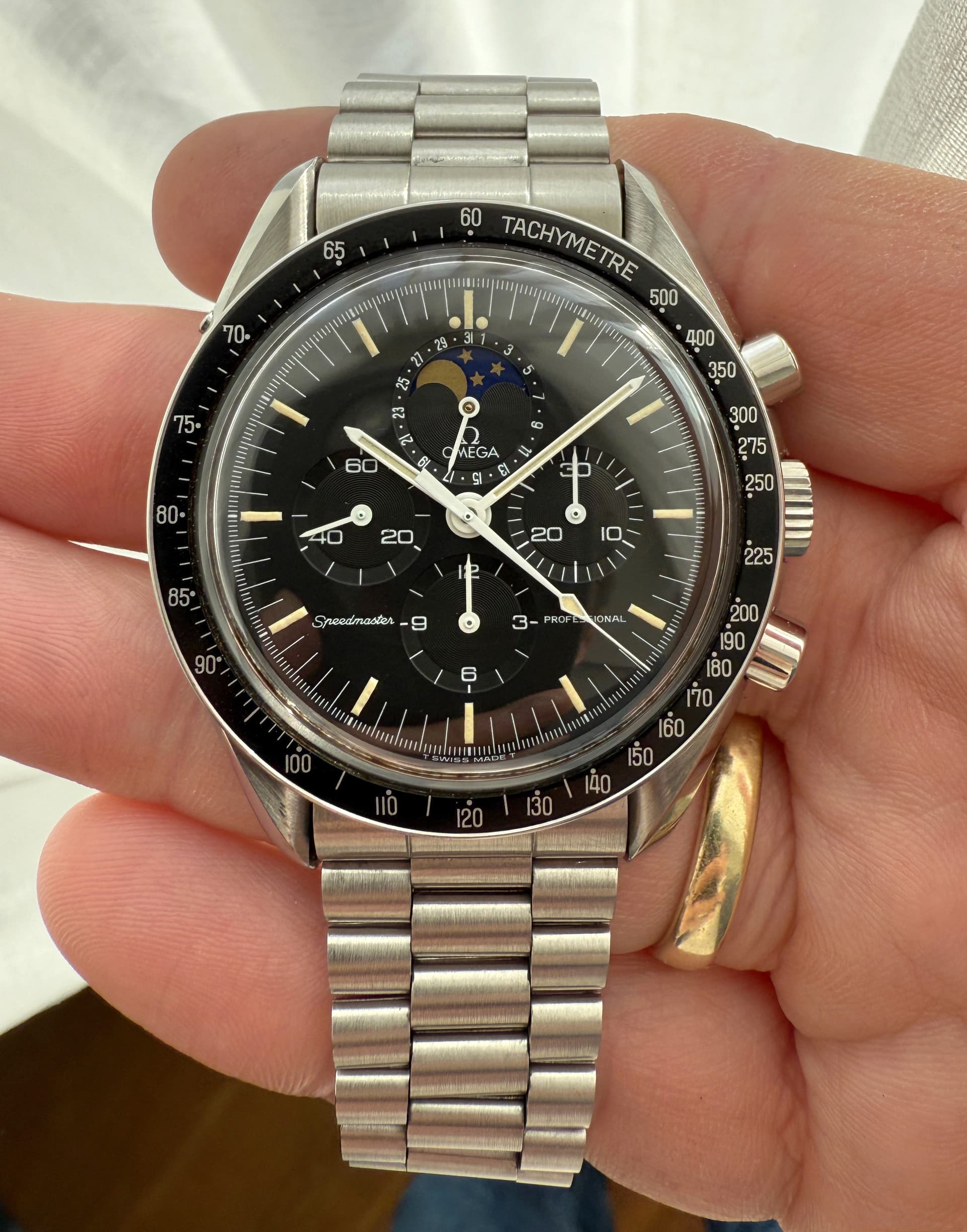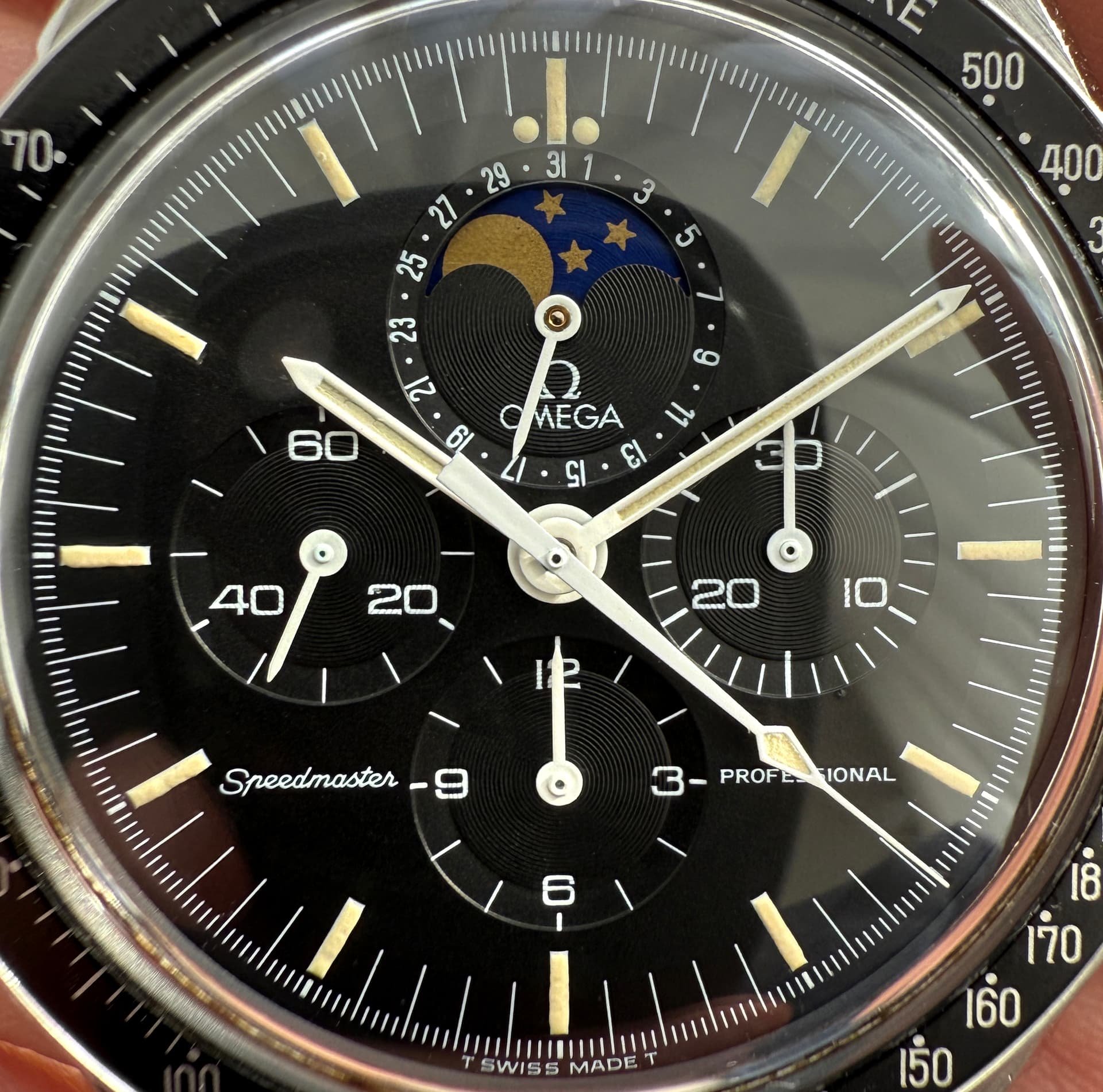 Gisteren nog een Speedymoon in het wild tegengekomen en het is mooi om de verschillen te zien. Naast de drie uitvoeringen van de “maanschijf” zijn er ook verschillen in de afwerking van de subdials. In totaal zijn er 1100 op stalen band geleverd (herkenbaar aan de gravure in het achterdeksel) en dus is het bijzonder dat er zoveel verschillen zijn.