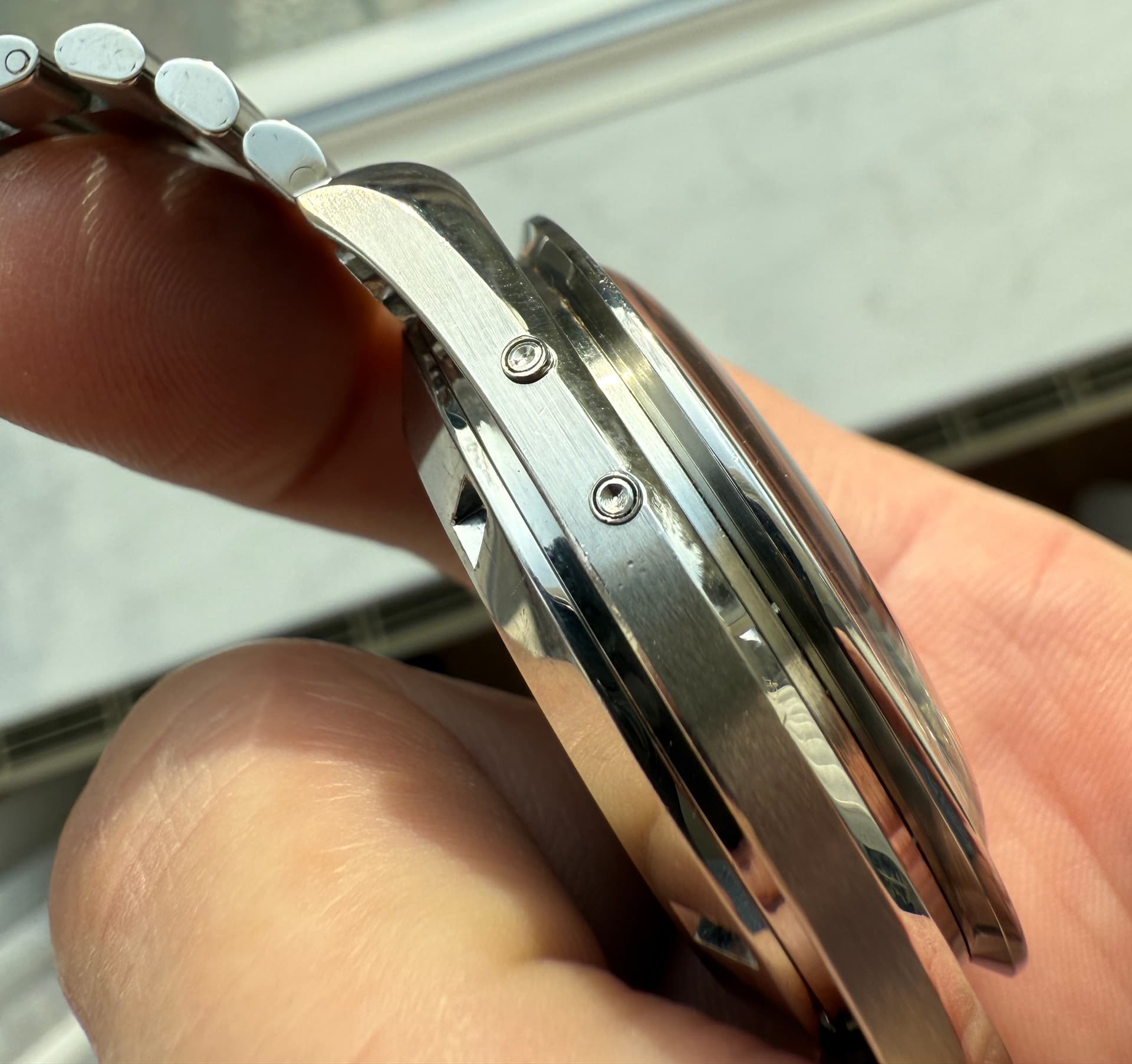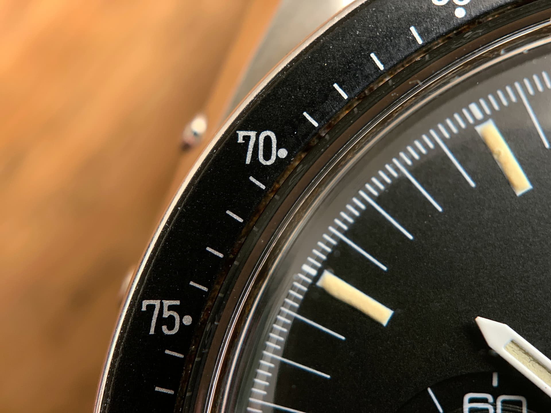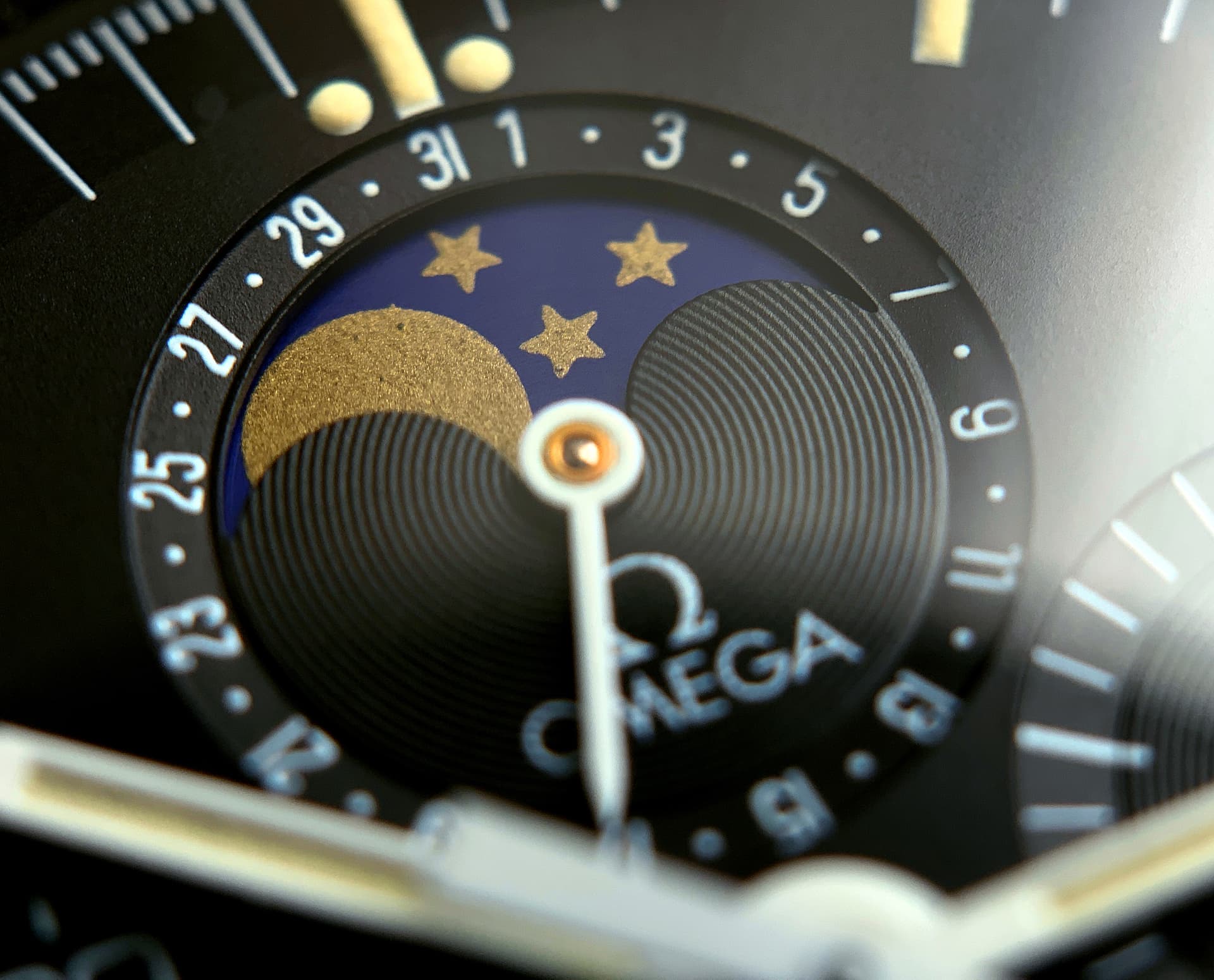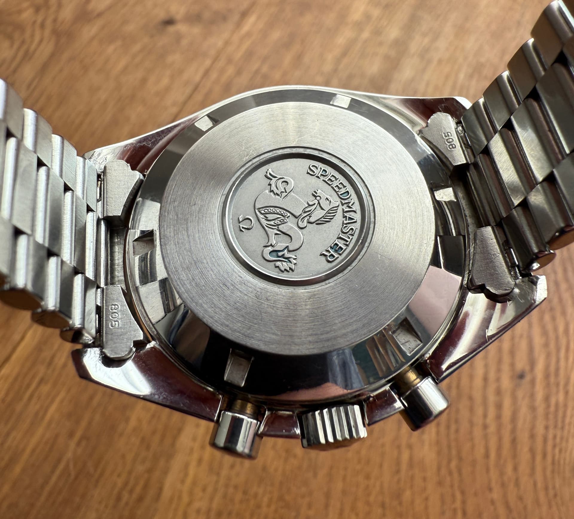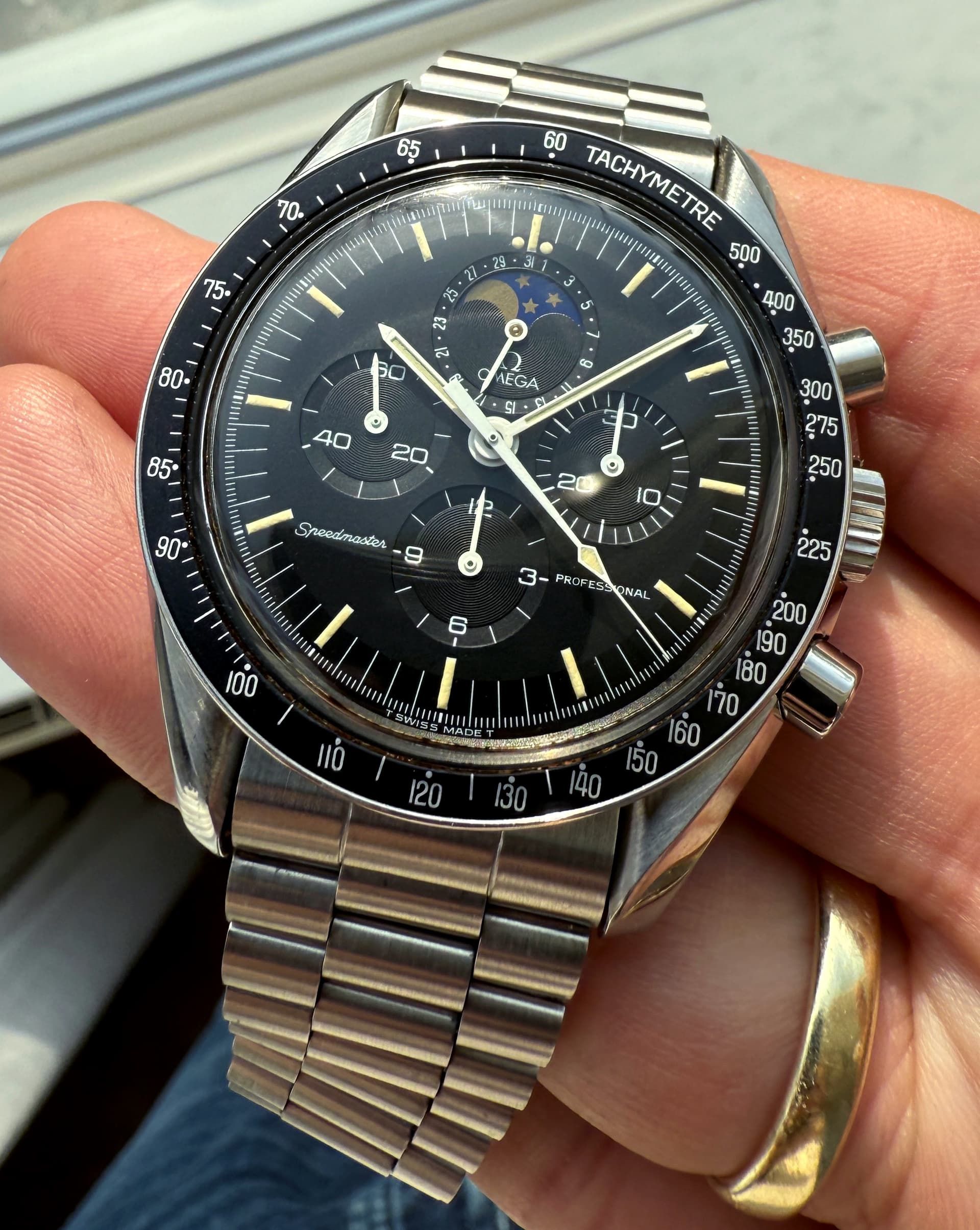 Zo snel kan het gaan in nog geen jaar tijd! Deze Speedymoon (1987) is vertrokken en heeft plaats gemaakt voor een iets mooiere (vind ik) uit begin 1986. Ik was al langer op zoek naar de 1447 band en deze heeft ook iets duidelijkere accentlijnen om de subdials. Dat was voor mij de meerprijs wel waard!