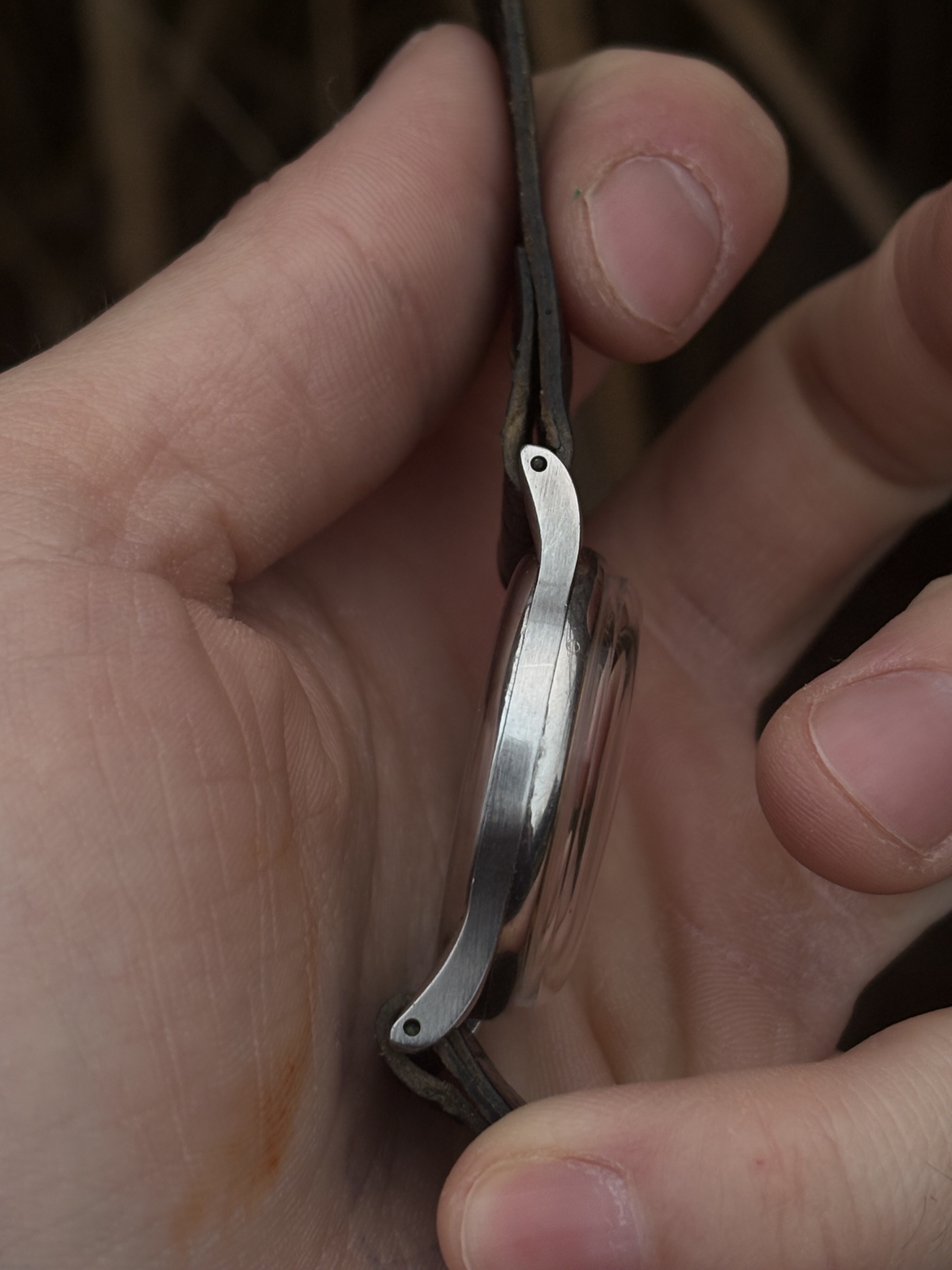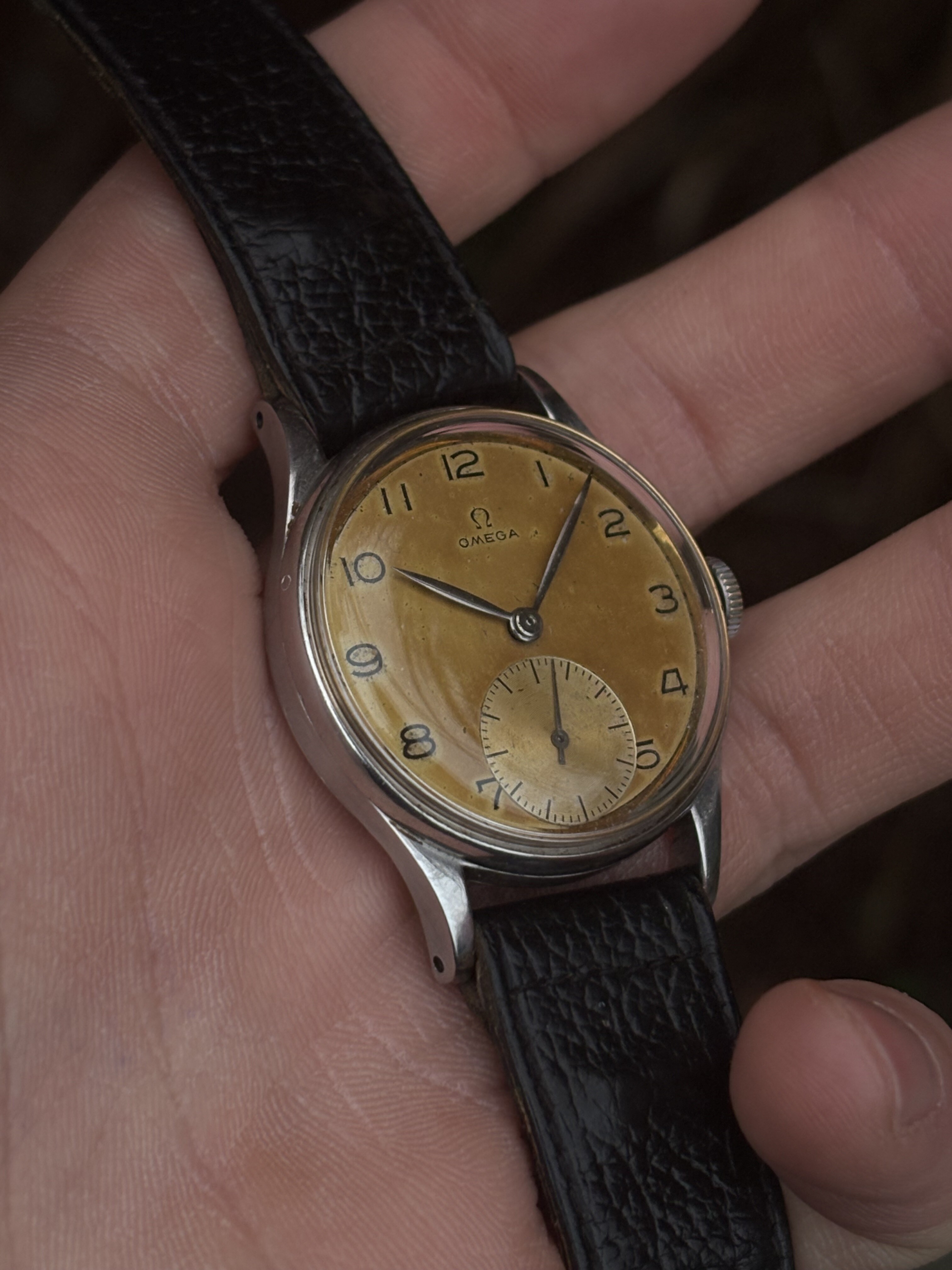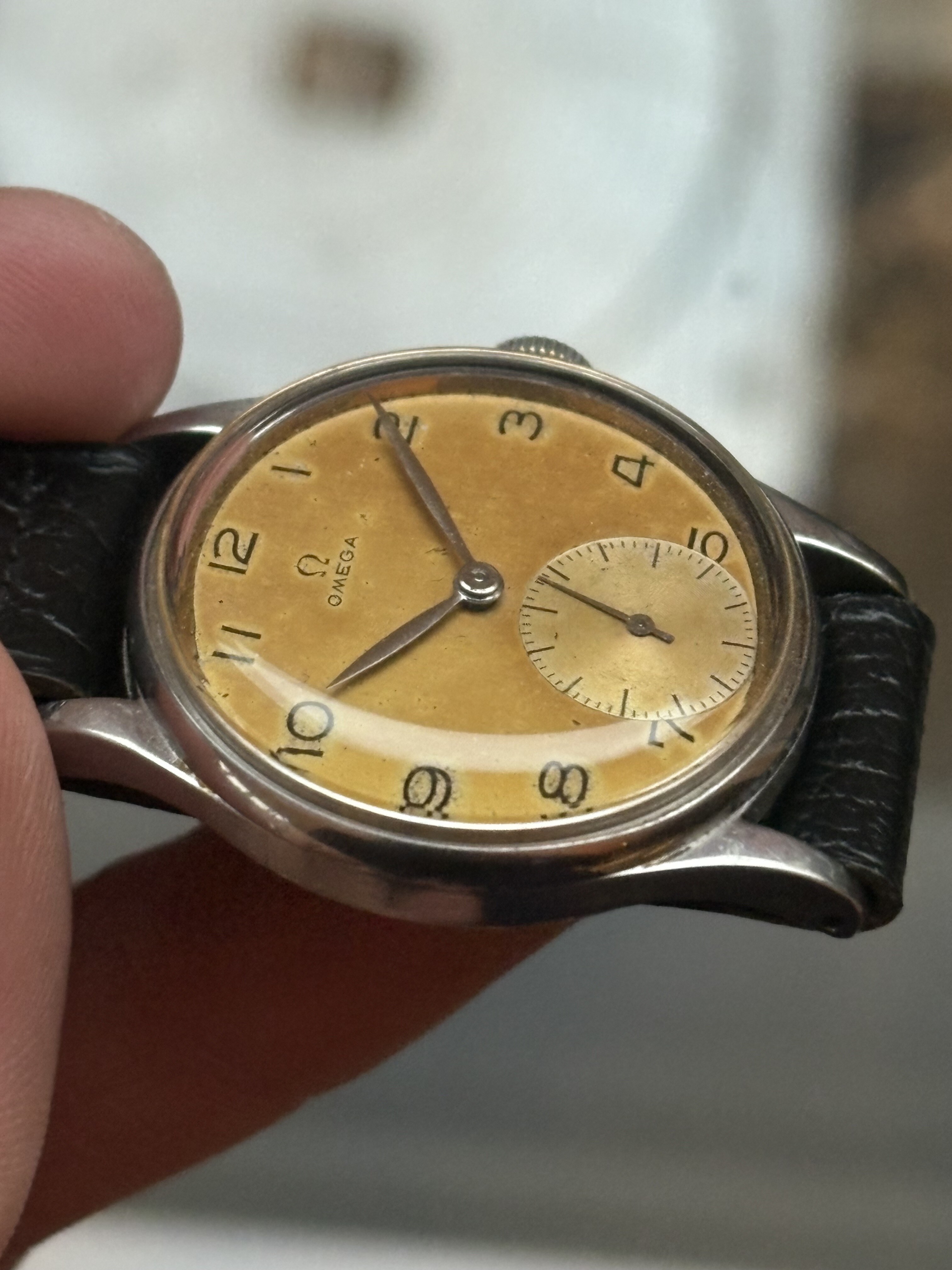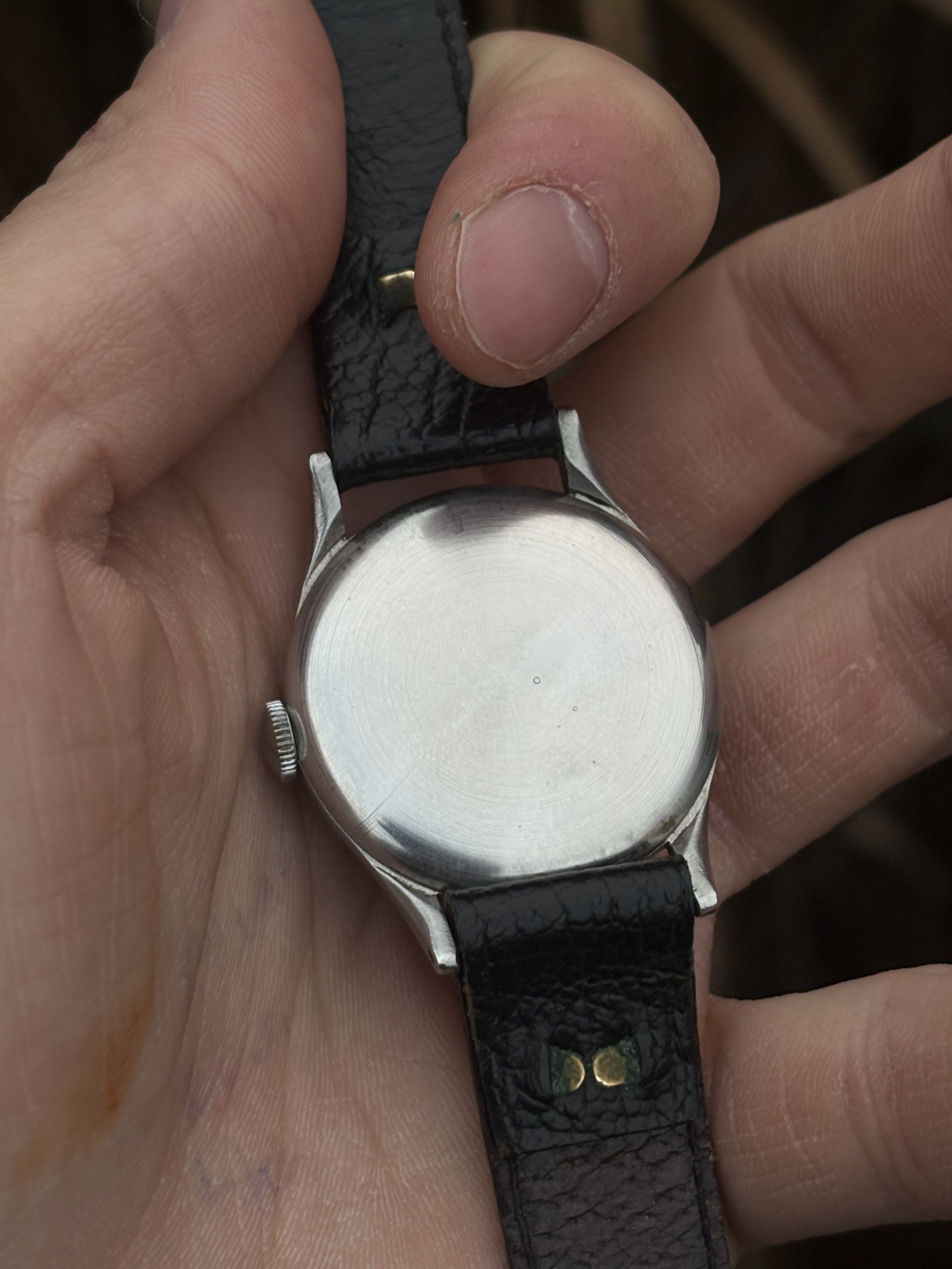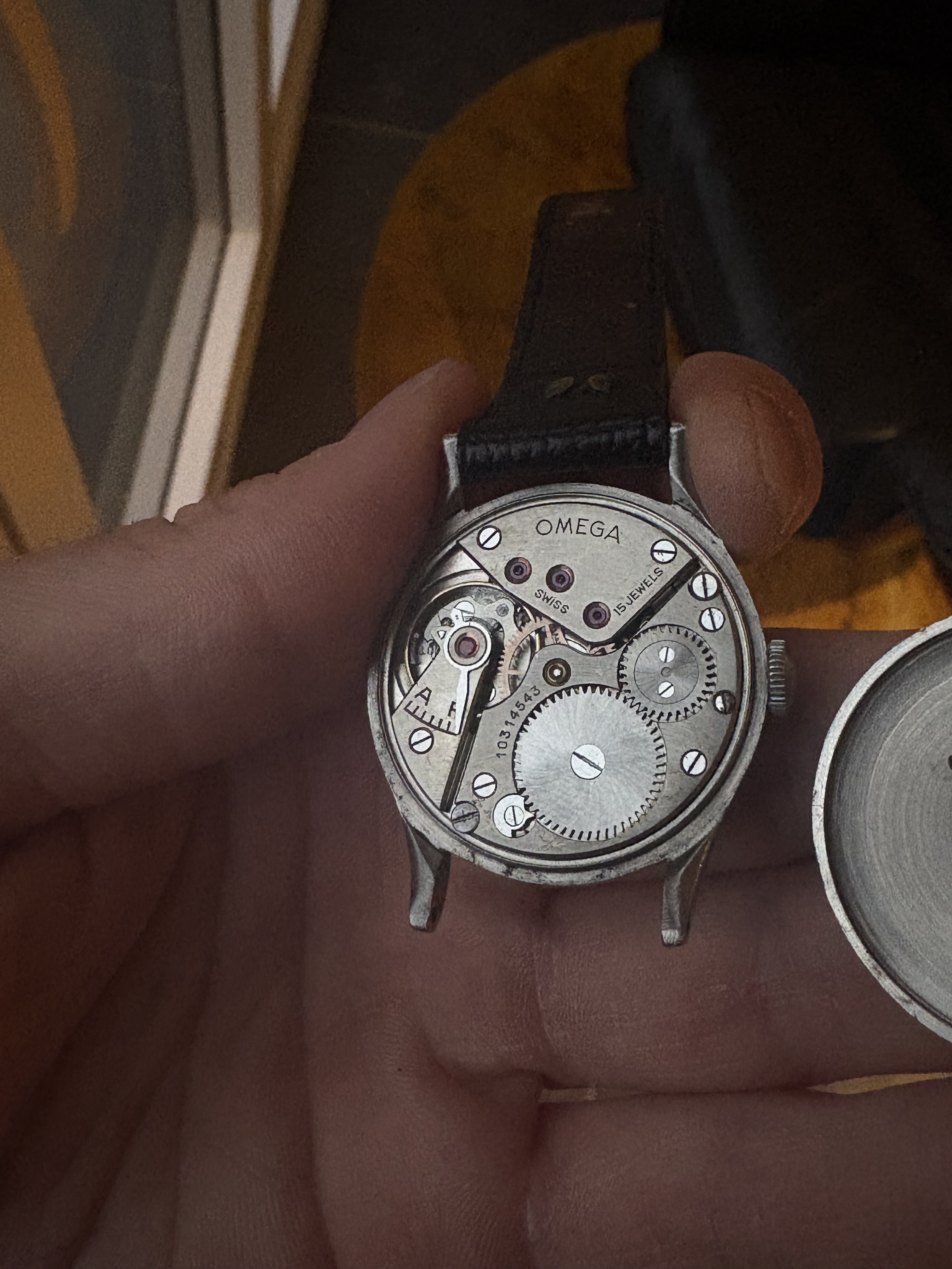 Conditie (krassen, werking etc): Het horloge doet wat hij moet doen en is daarbuiten in goede staat. De kast ziet er nog fantastisch uit. De wijzerplaat heeft een mooi egale bruingele patina gekregen over de jaren heen.