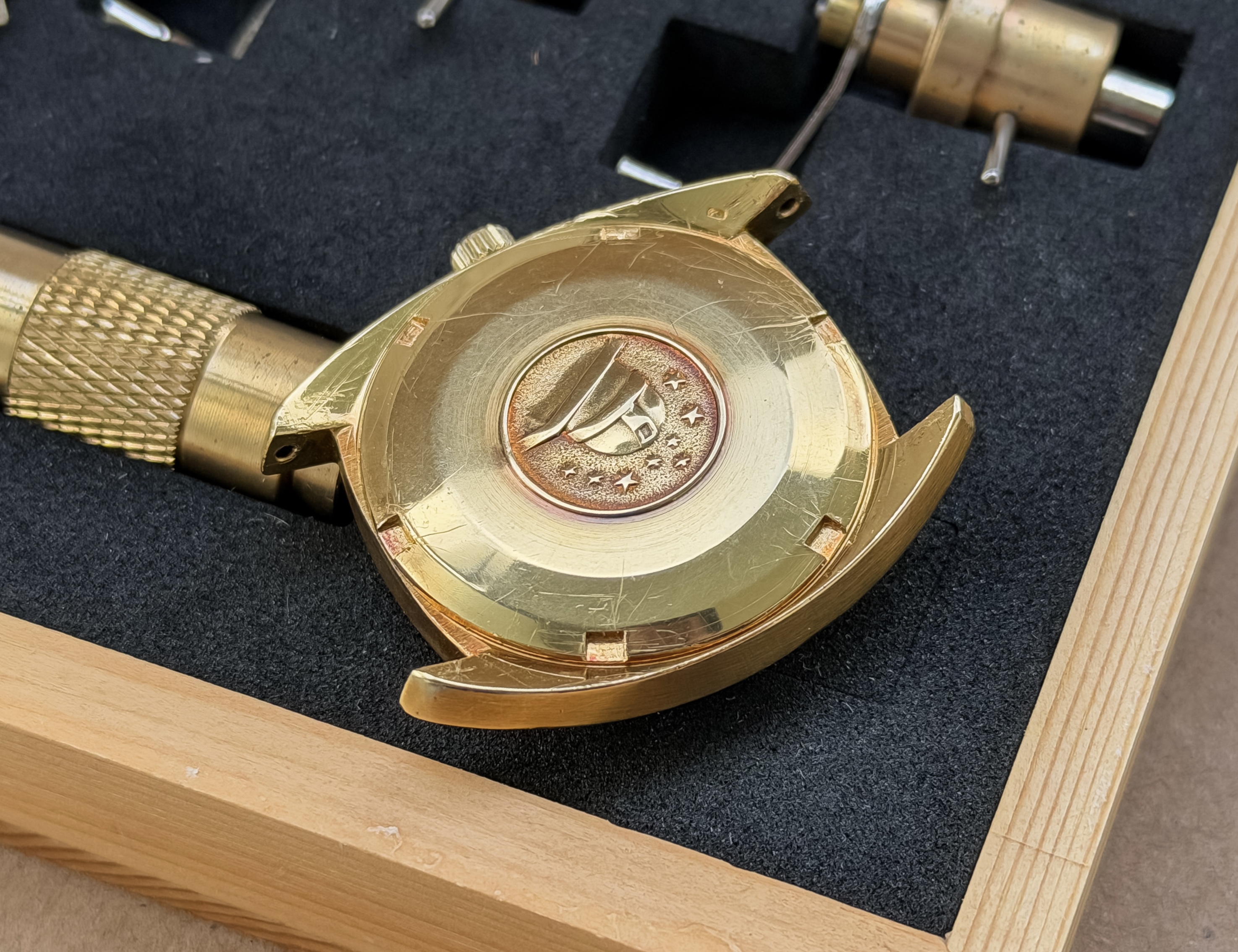 Horloge is inmiddels 59 jaar oud en is in ongepolijste staat, er zijn opvallende gebruikerssporen aanwezig.