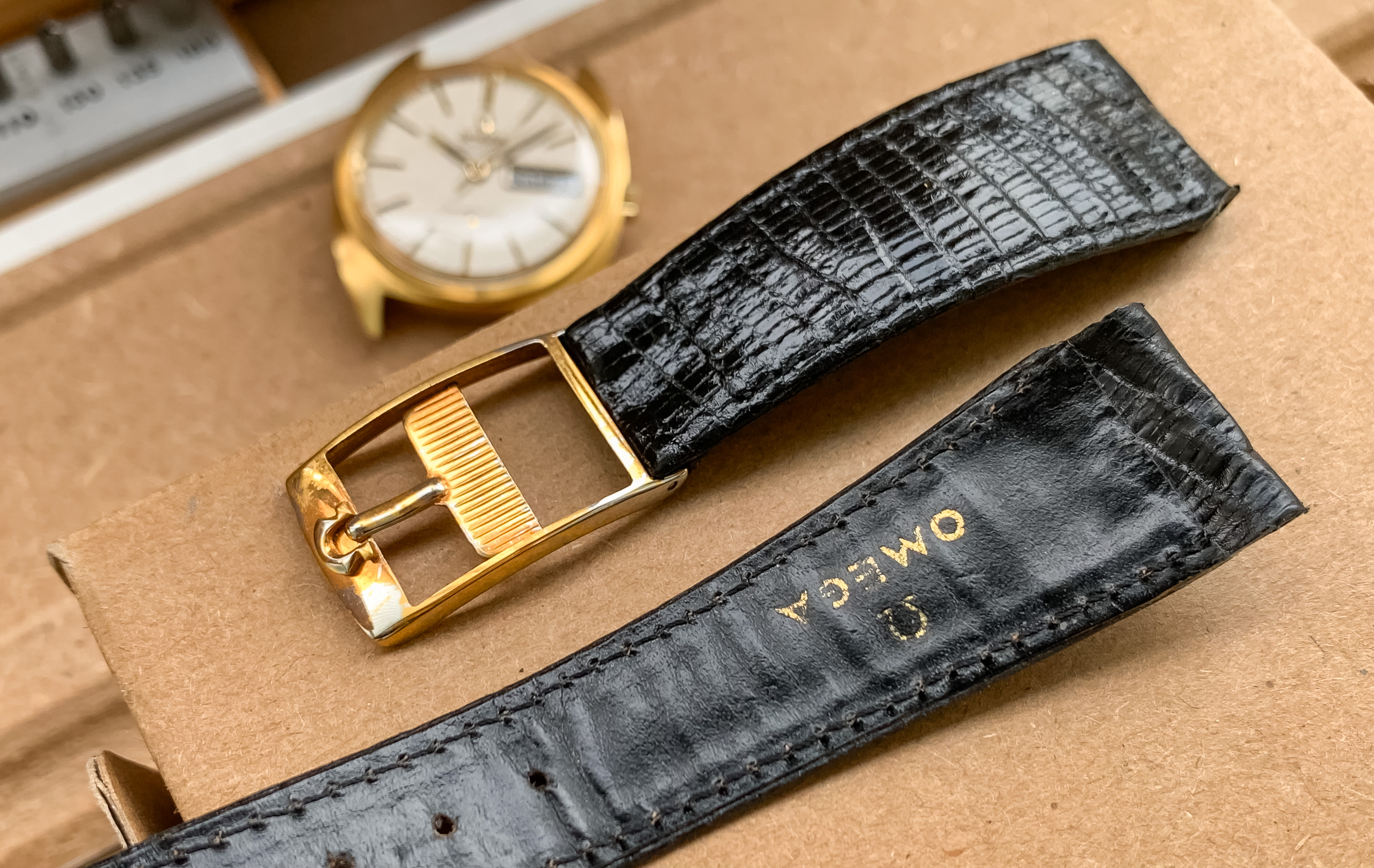 Het oude originele Omega lederen band is inbegrepen met het gesp, het gesp is verguld.