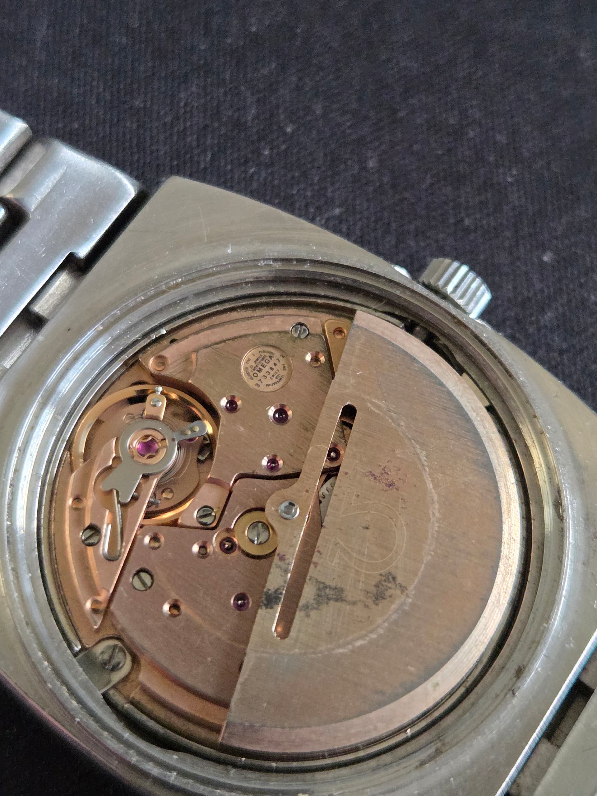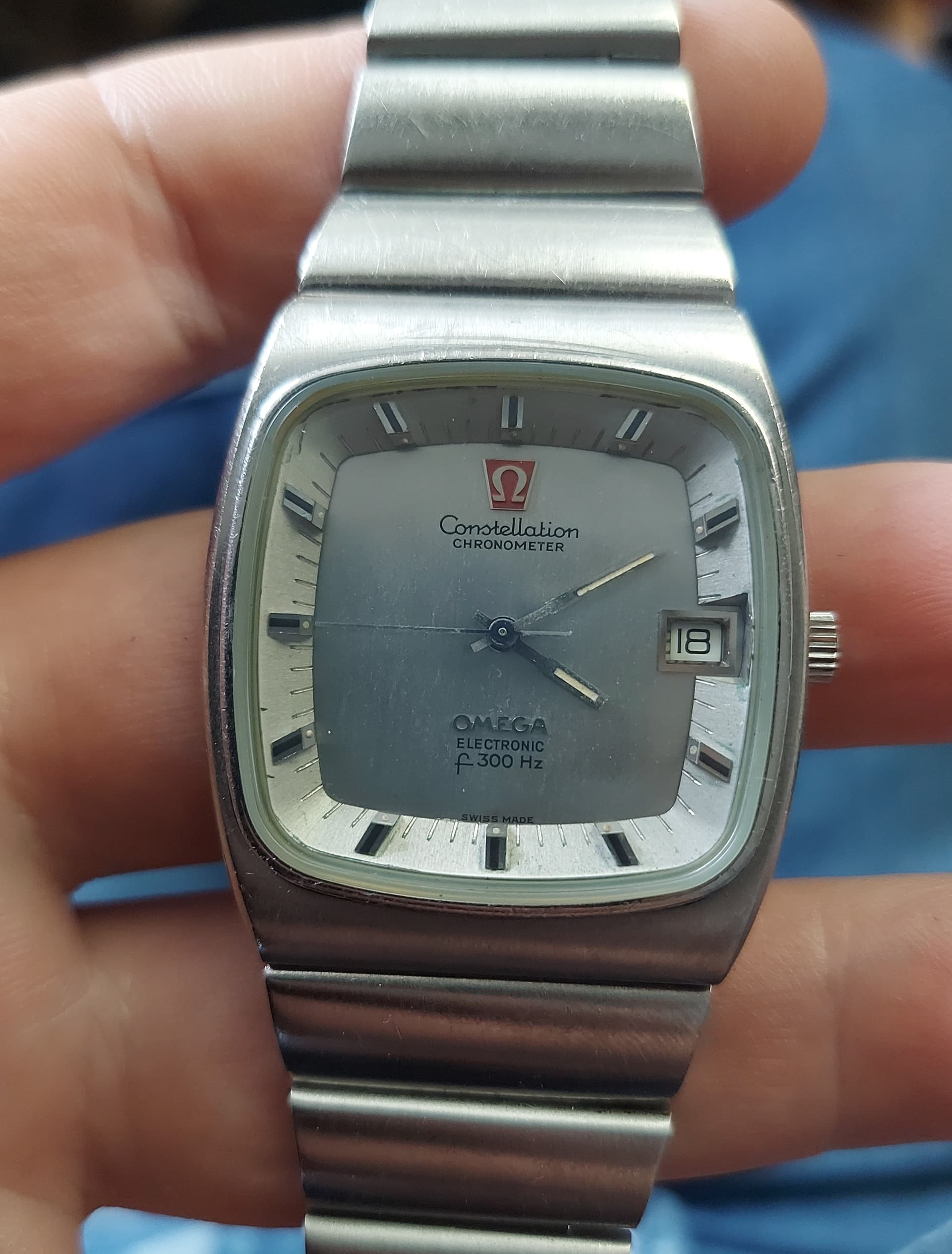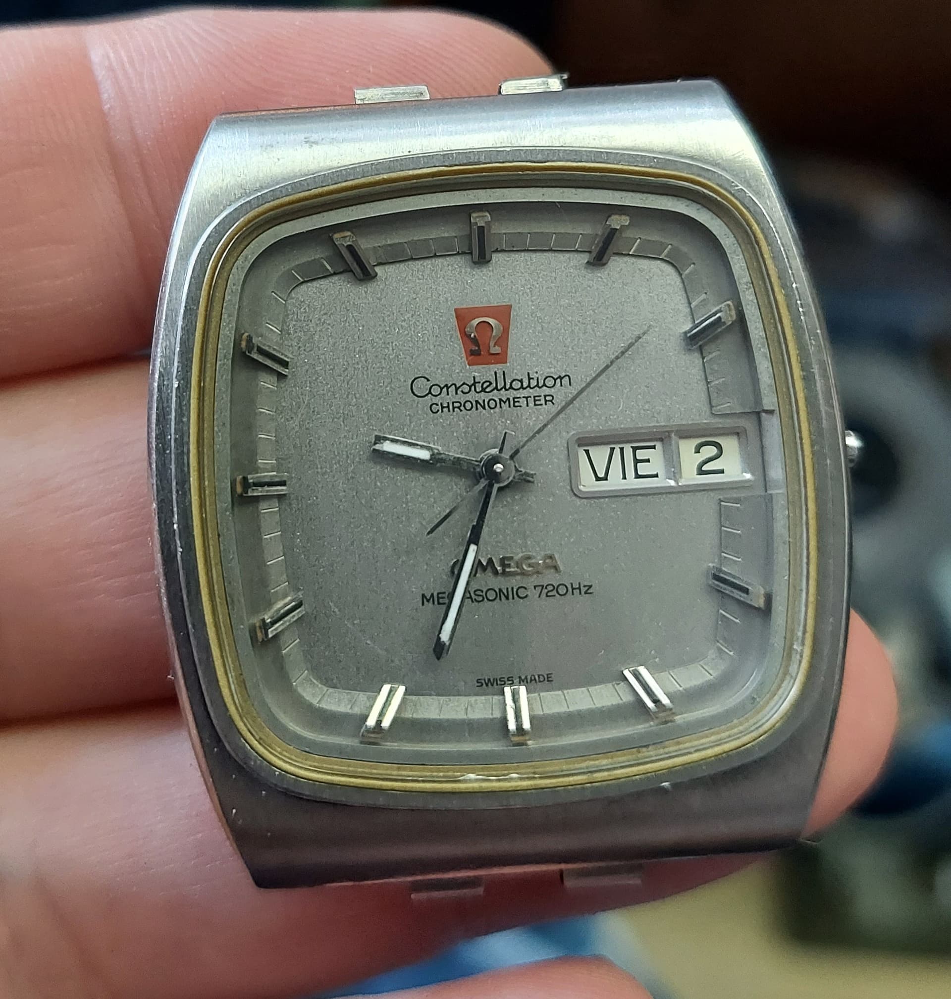 Apart hoe die op mijn stemvork Omega lijkt. Er lijkt wat mee gebeurt te zijn, kriebelig opschrift op de wijzerplaat en die grote open plek rechts van de datum.