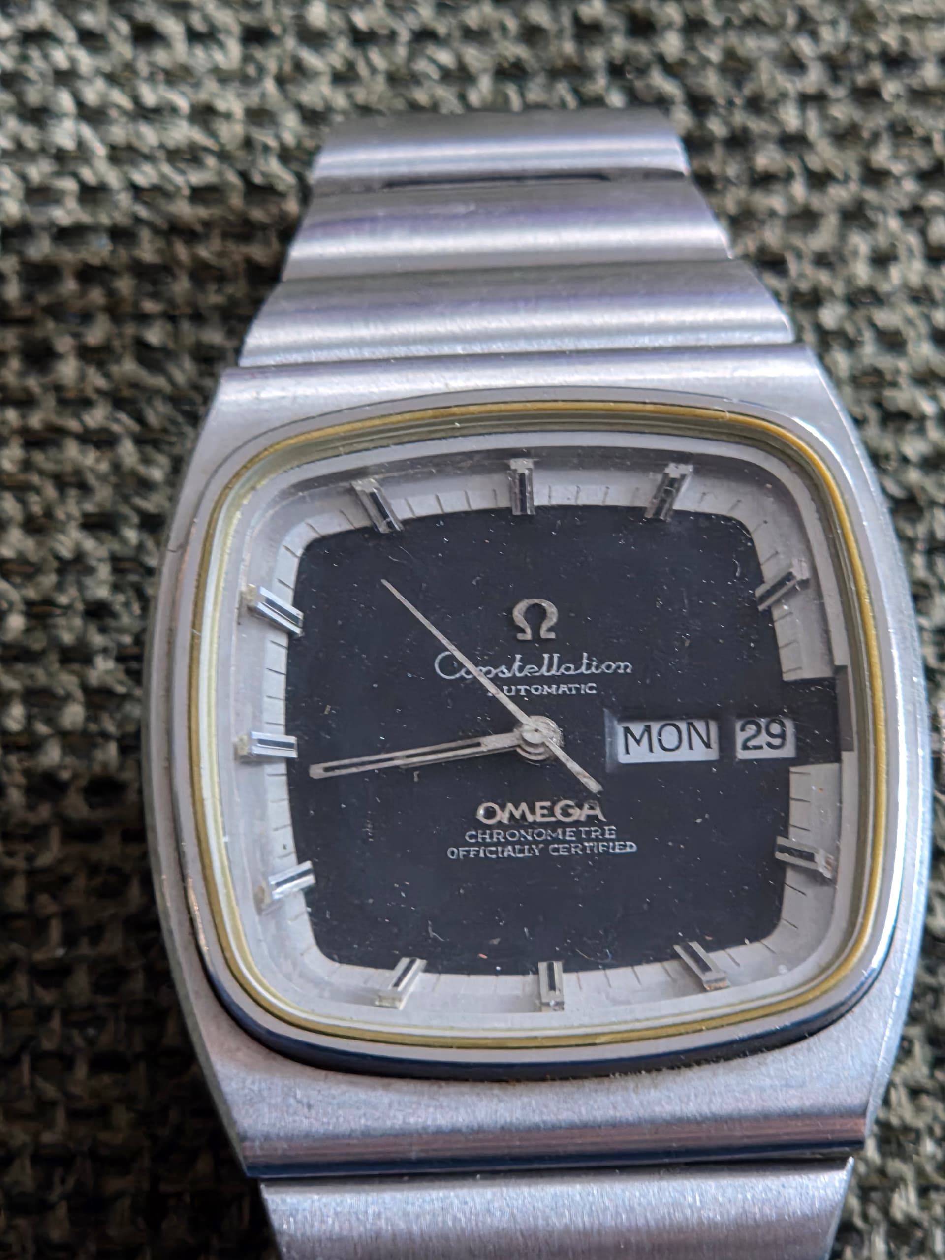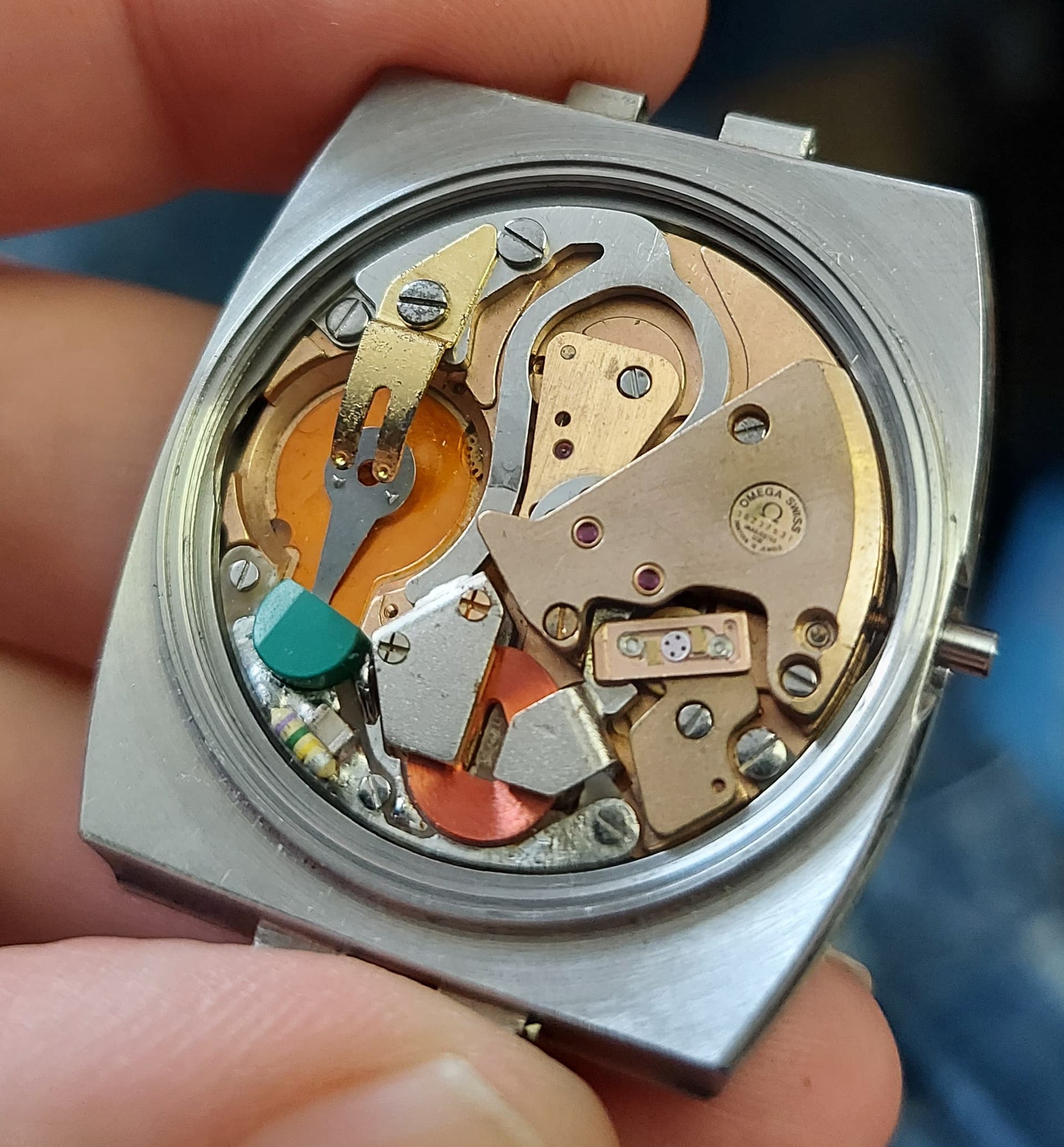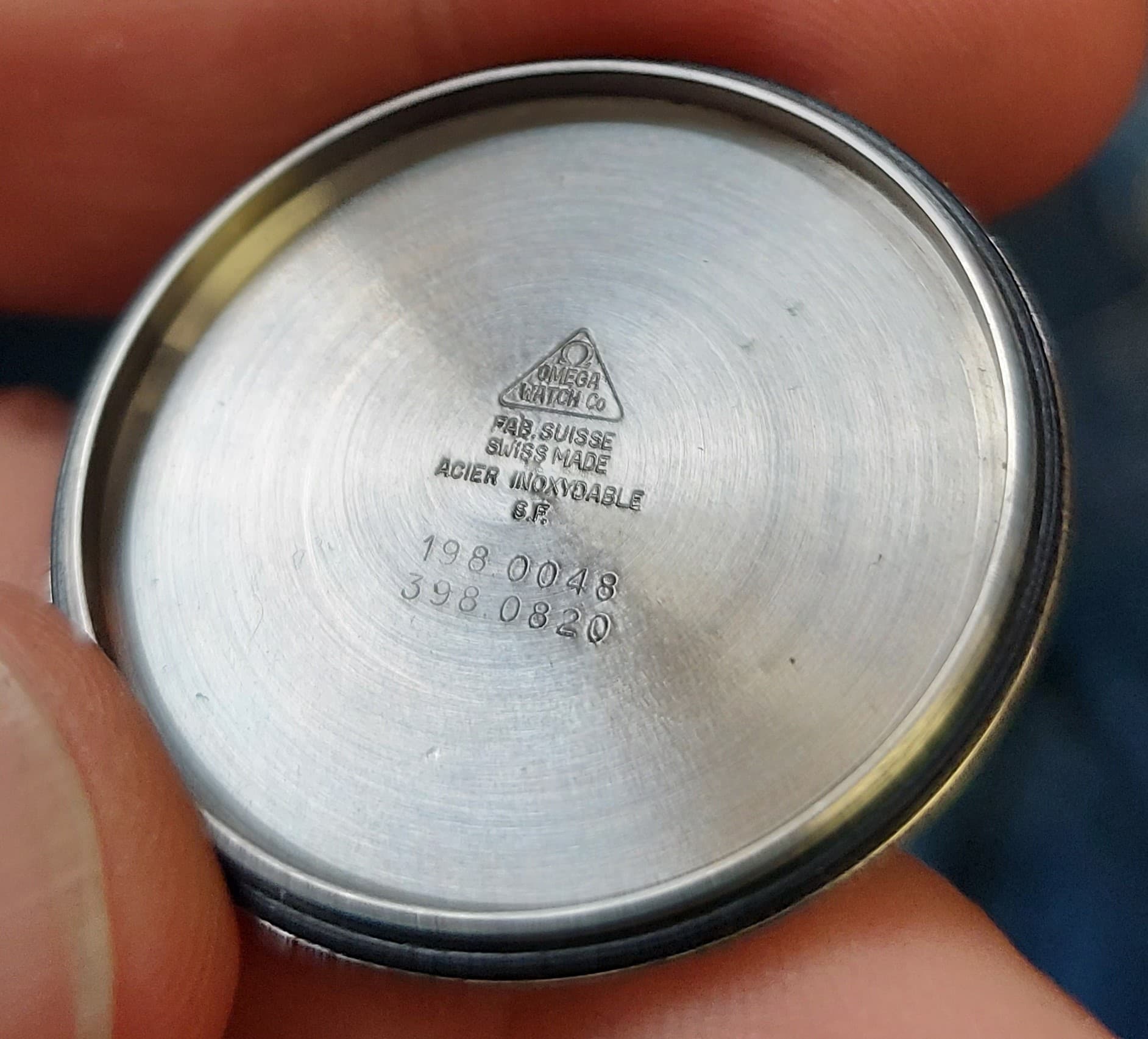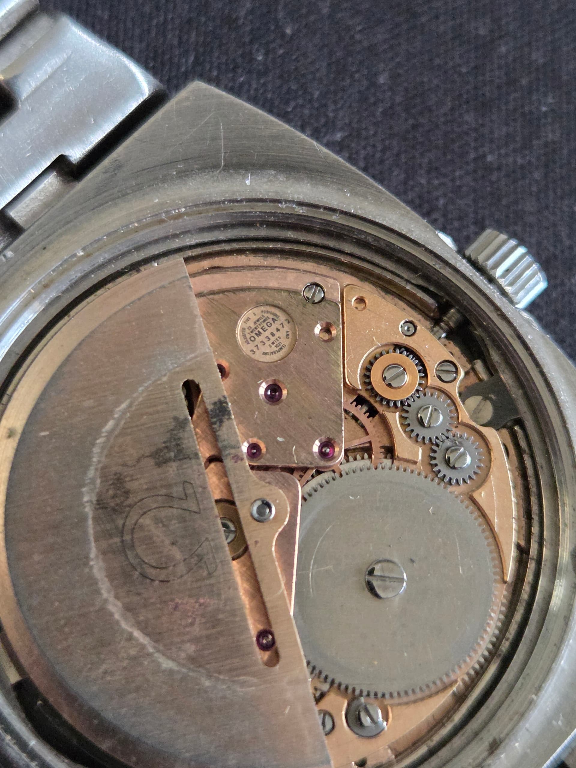 Apart hoe die op mijn stemvork Omega lijkt. Er lijkt wat mee gebeurt te zijn, kriebelig opschrift op de wijzerplaat en die grote open plek rechts van de datum.