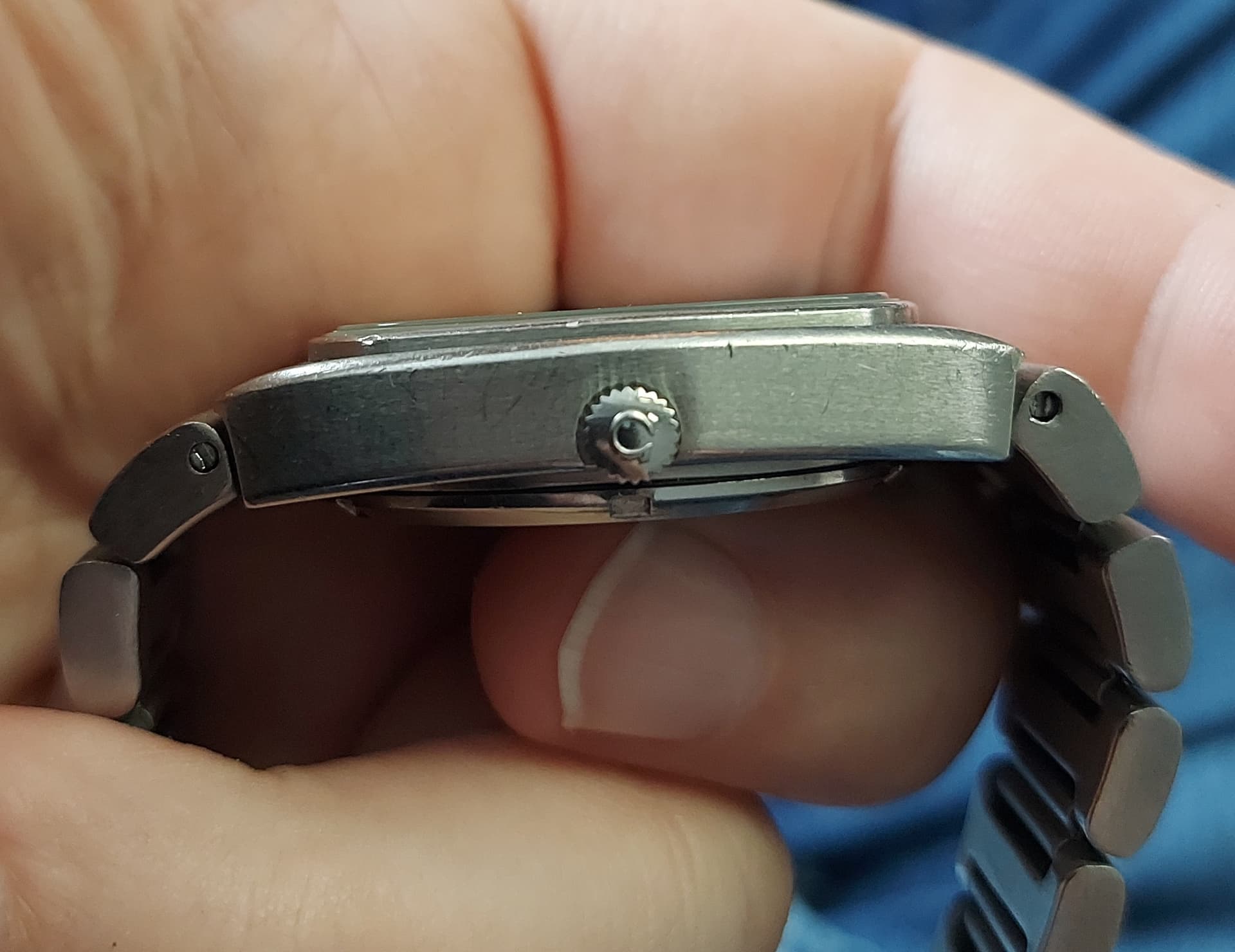 Hoi, deze Omega heb ik al heel lang maar weet er weinig van. Jaren 70? Ik heb veel op internet gezocht maar kom deze niet tegen: wijzerplaat, opstaande kant waat glas in zit en a