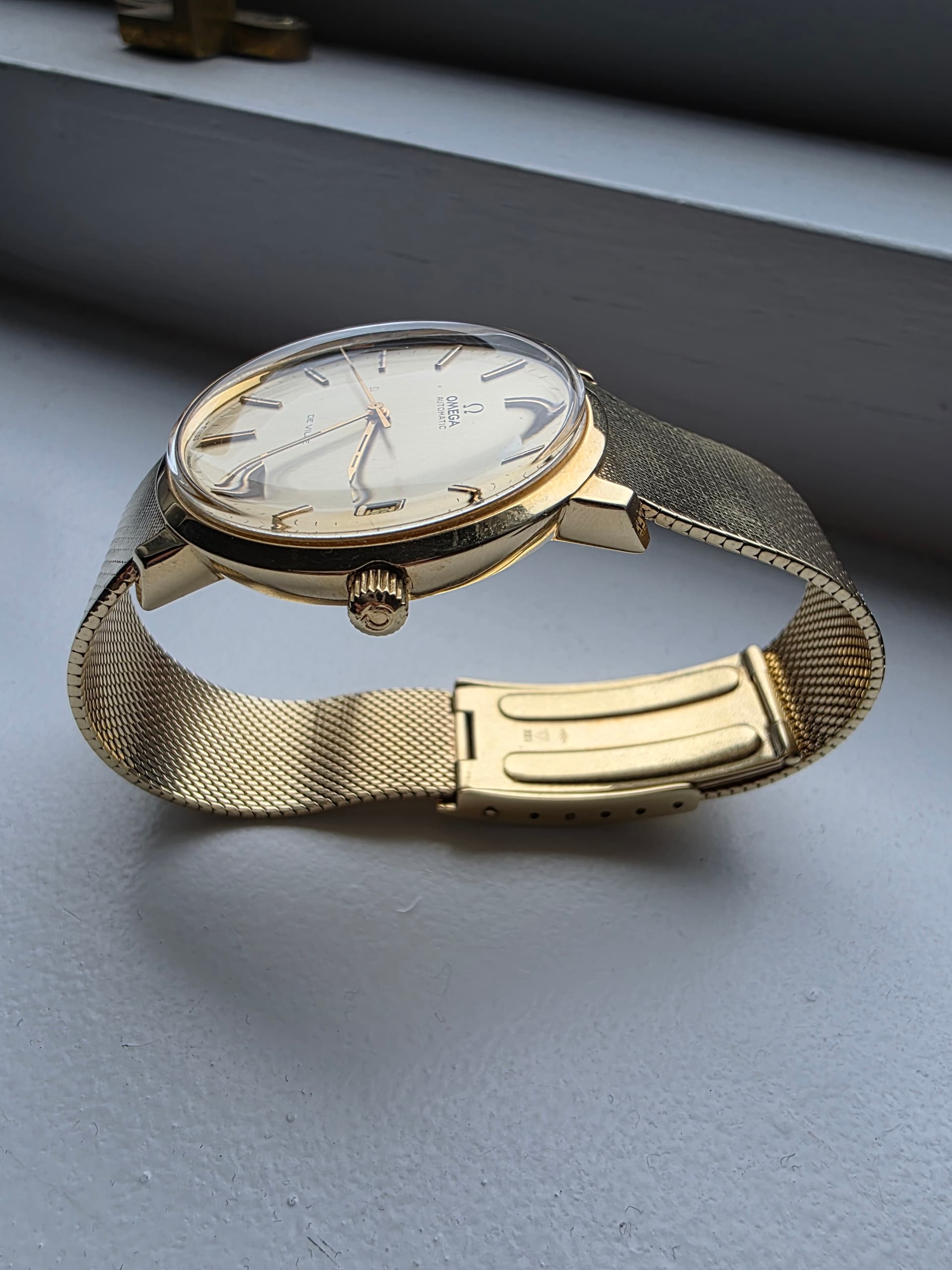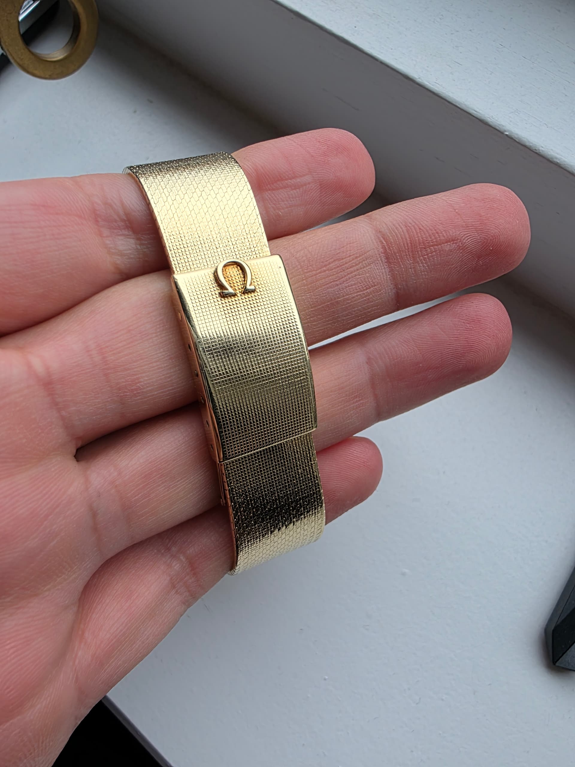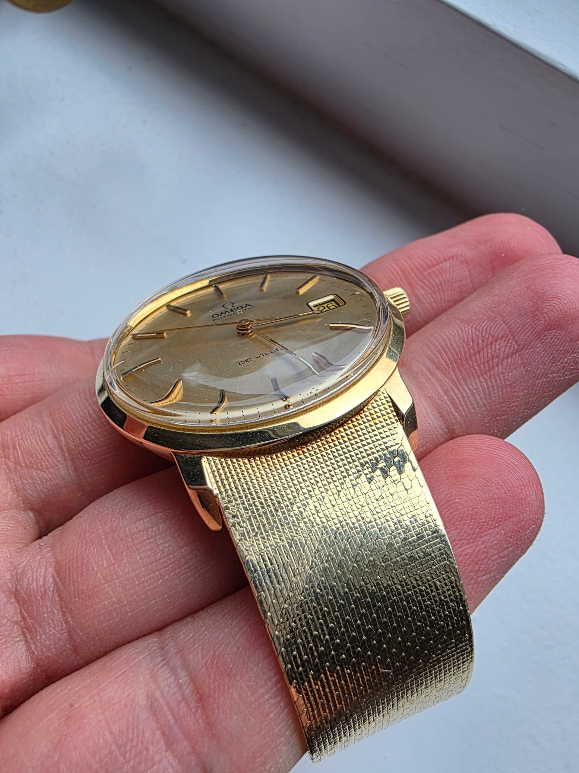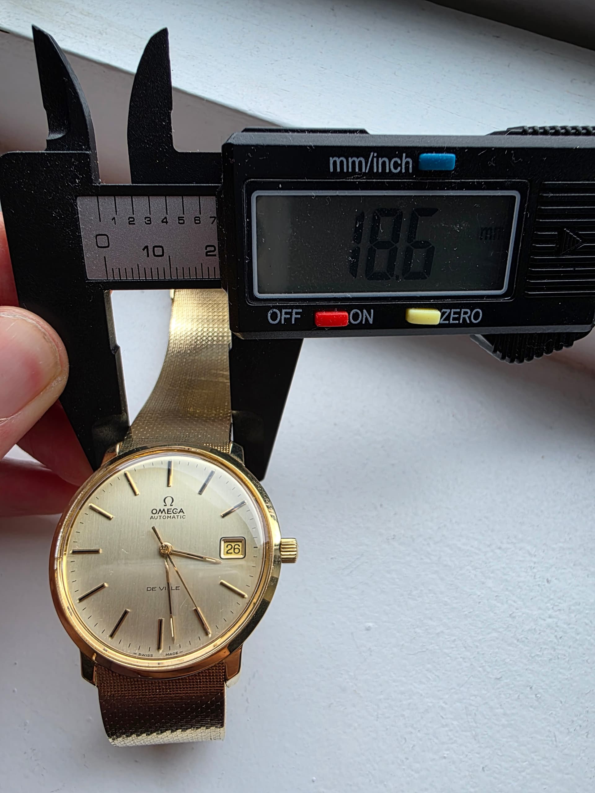 Het is een bijzonder horloge met een voor die tijd grote Diameter, 36mm. De meeste zijn 34mm. De gouden band is lekker ruim en bezit op 18.6mm dus voelt niet ielig. Ook heeft deze band een mooie omega clasp met wat micro adjust punten, is ook vaak niet mogelijk. Mijn pols is 17.5 cm en kan nog 1 punt strakker maar 3 punten ruimer.