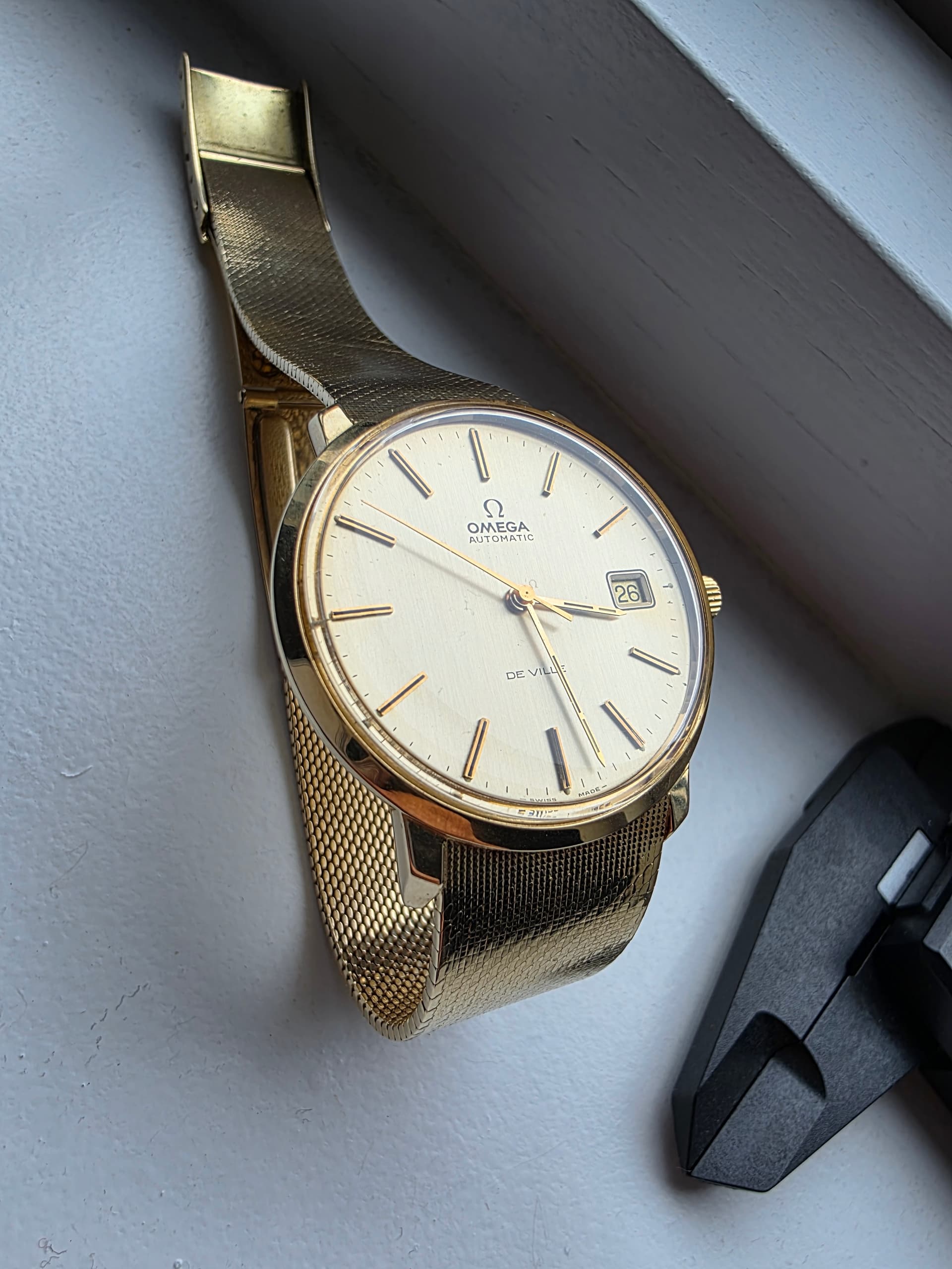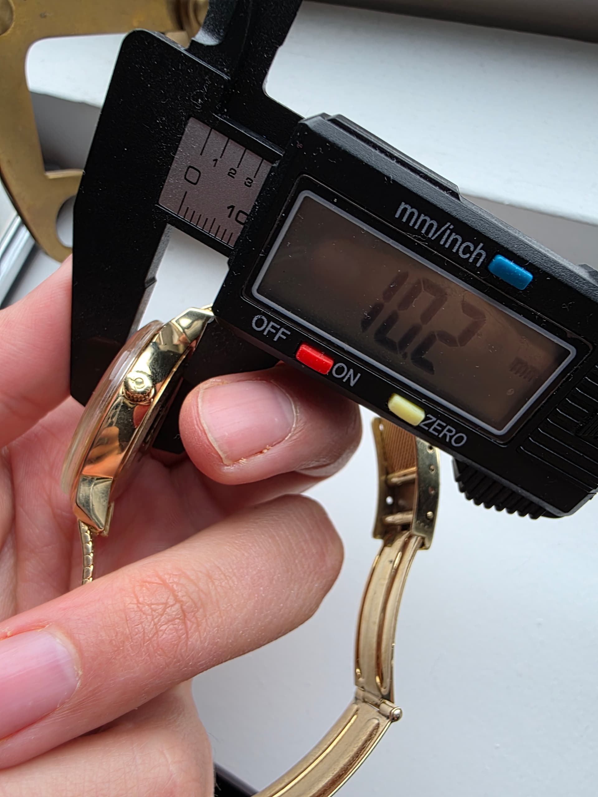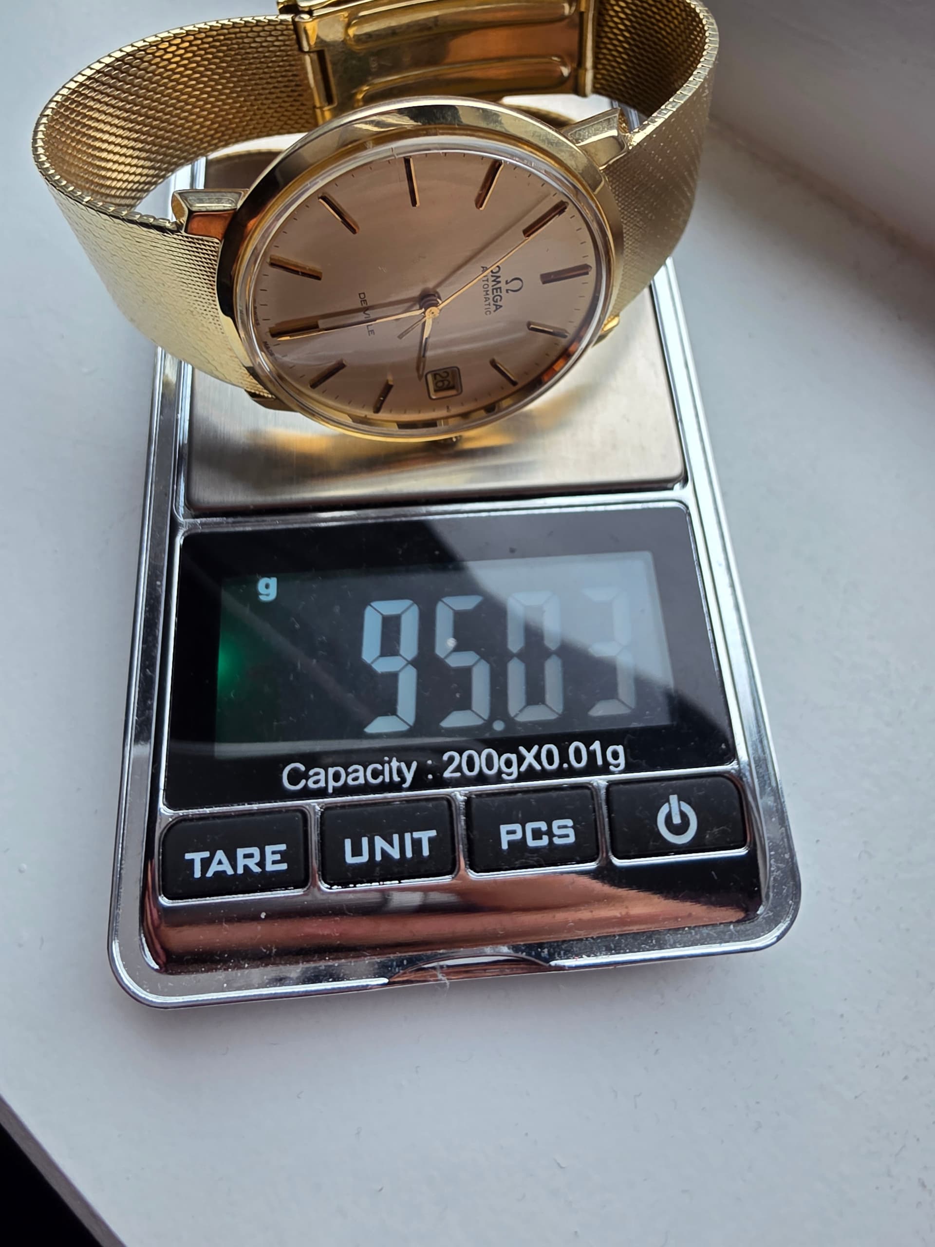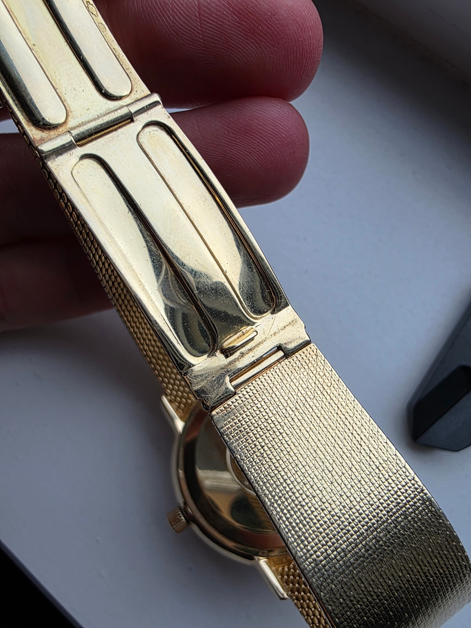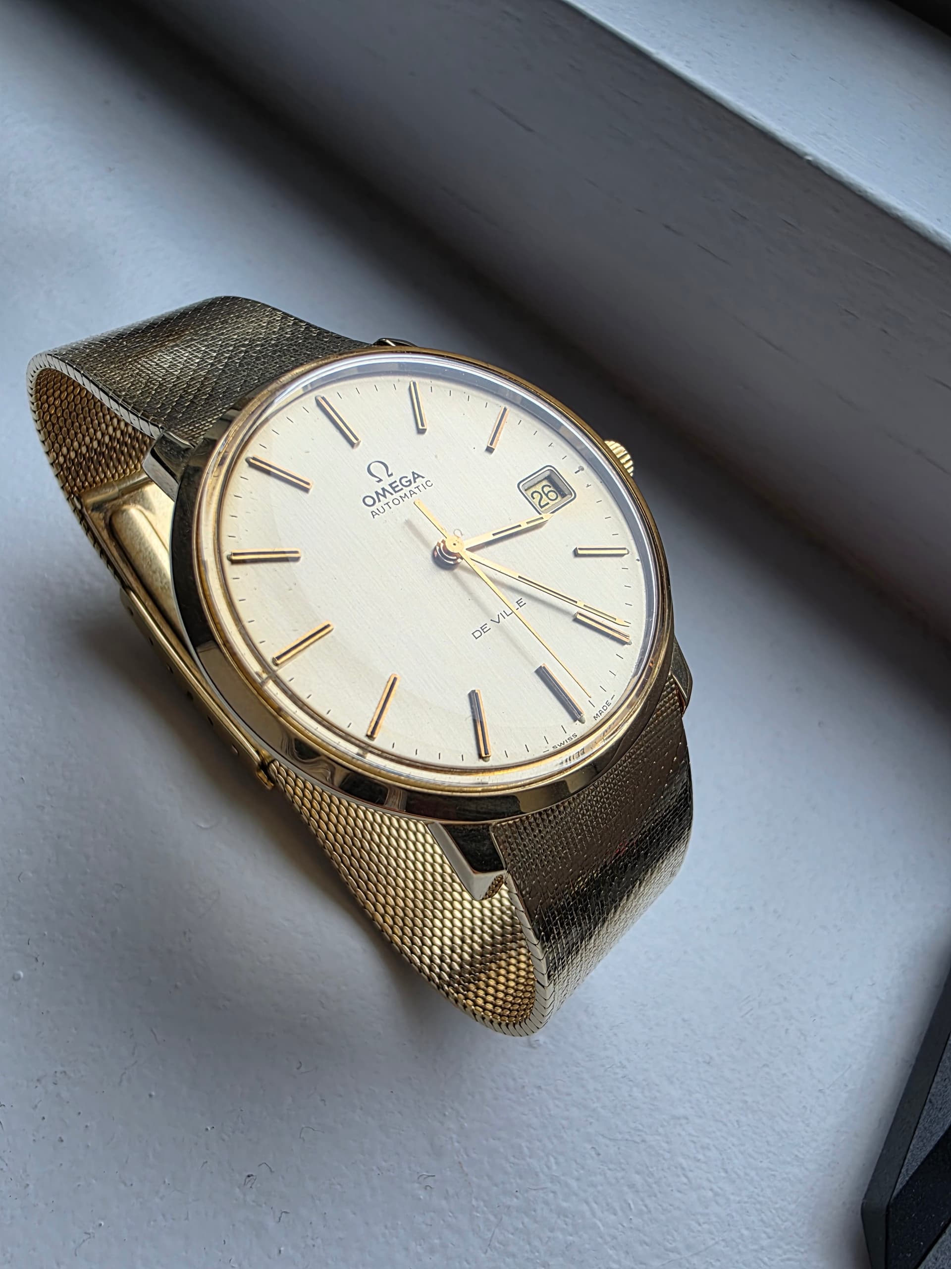 Het is een bijzonder horloge met een voor die tijd grote Diameter, 36mm. De meeste zijn 34mm. De gouden band is lekker ruim en bezit op 18.6mm dus voelt niet ielig. Ook heeft deze band een mooie omega clasp met wat micro adjust punten, is ook vaak niet mogelijk. Mijn pols is 17.5 cm en kan nog 1 punt strakker maar 3 punten ruimer.