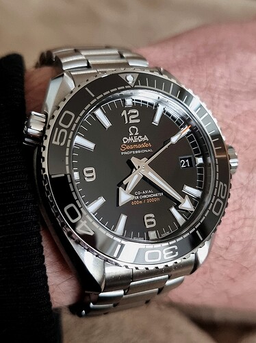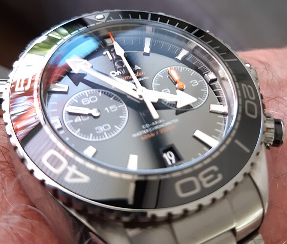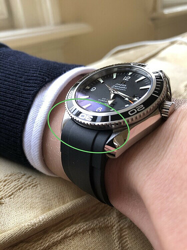 Deze band is idd pas sinds een paar weken voor de PO verkrijgbaar. Alexandre (CEO van Zealande) vertelde mij dat de band niet specifiek ontworpen is voor de Planet Ocean, maar hier merk je weinig van. De band schuurt niet tegen de bezelrand aan, waardoor de bezel nog altijd even soepel draait. Er zit een spleet van 1mm tussen de kast en het uiteinde van de band, maar dit is nauwelijks merkbaar (onder meer vanwege de schaduw die de bezel hierop werpt):