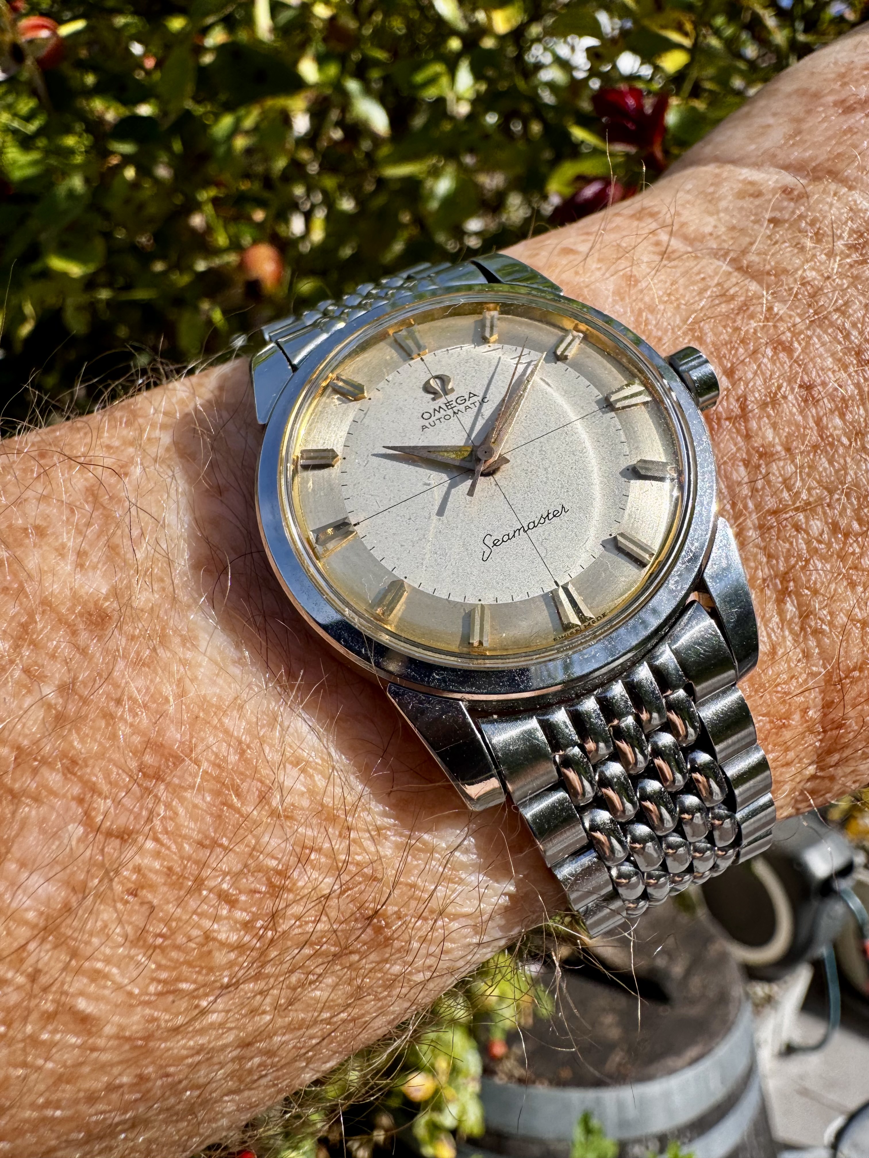De cross-hair en two-tone wijzerplaat in off-white en gouden/champagne accenten in combinatie met het grote logo maakt dit een zeer zeldzame Seamaster.