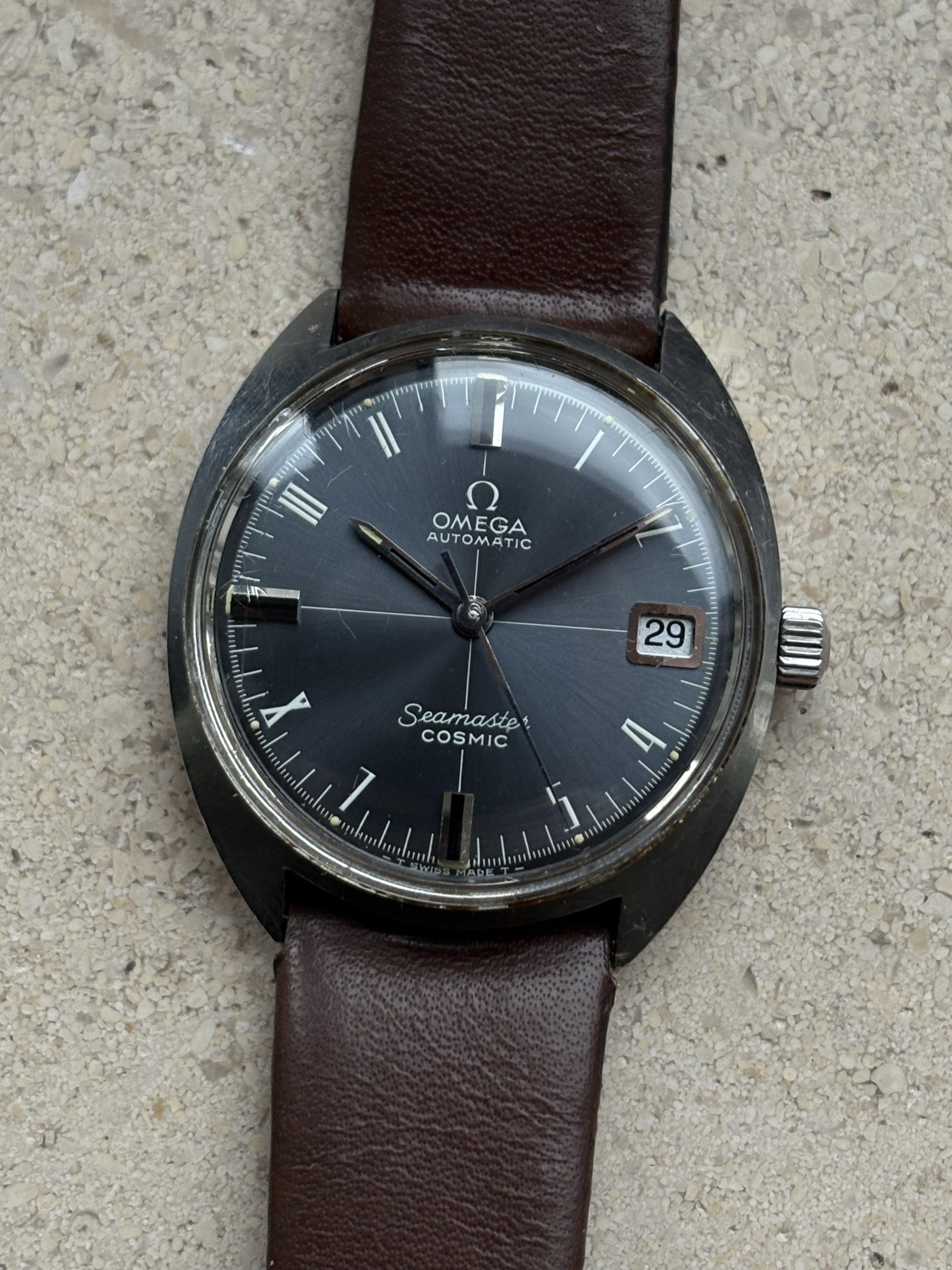 Conditie (krassen, werking etc): Deze Omega werkt prima en doet wat hij moet doen. Het horloge is in algehele goede staat, op het plexiglaasje na. Waarom is deze niet vervangen? Wel, omdat het een origineel Omega gesigneerde plexi betreft.