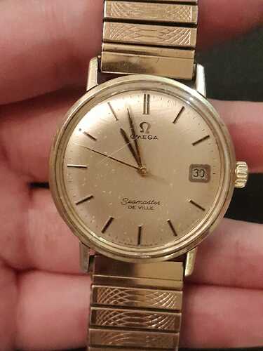 Omega Seamaster de Ville, niet moeders mooiste meer maar dat is ook niet erg. Het horloge is ongeveer 40jaar oud. Ik ben hier nieuw op het forum. Het horloge heeft mijn vader ooit van mijn opa gekregen toen hij zelf 16 was en nu ben ik de trotse eigenaar van het horloge, maar weet er zelf vrij weinig van. Ik wou hem toch met jullie delen.